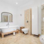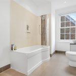 Travertine marble tiled floor with matching wall tiling, large freestanding cradle bath with mixer tap and shower attachment, corner quadrant shower cubicle with glazed screen doors and mains fed shower mixer, matching large wash hand basin with mixer tap twin glazed shelves beneath, and illuminated mirror fronted bathroom cabinet with shaver point, wall hung low-level WC with concealed cistern., chromium heated towel warmer and additional radiator. Multi-paned hardwood window overlooking the rear garden. Extractor fan and ceiling down lighting.