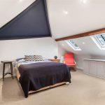 A feature large bedroom with angled roof slopes with exposed beams, ceiling down lighters, two Velux double glazed rooflights with views towards Kenilworth Castle over Abbey Fields, double door built in wardrobe cupboard, fitted corner desk unit with shelving and storage cupboards, two radiators and a multi-paned glazed door to