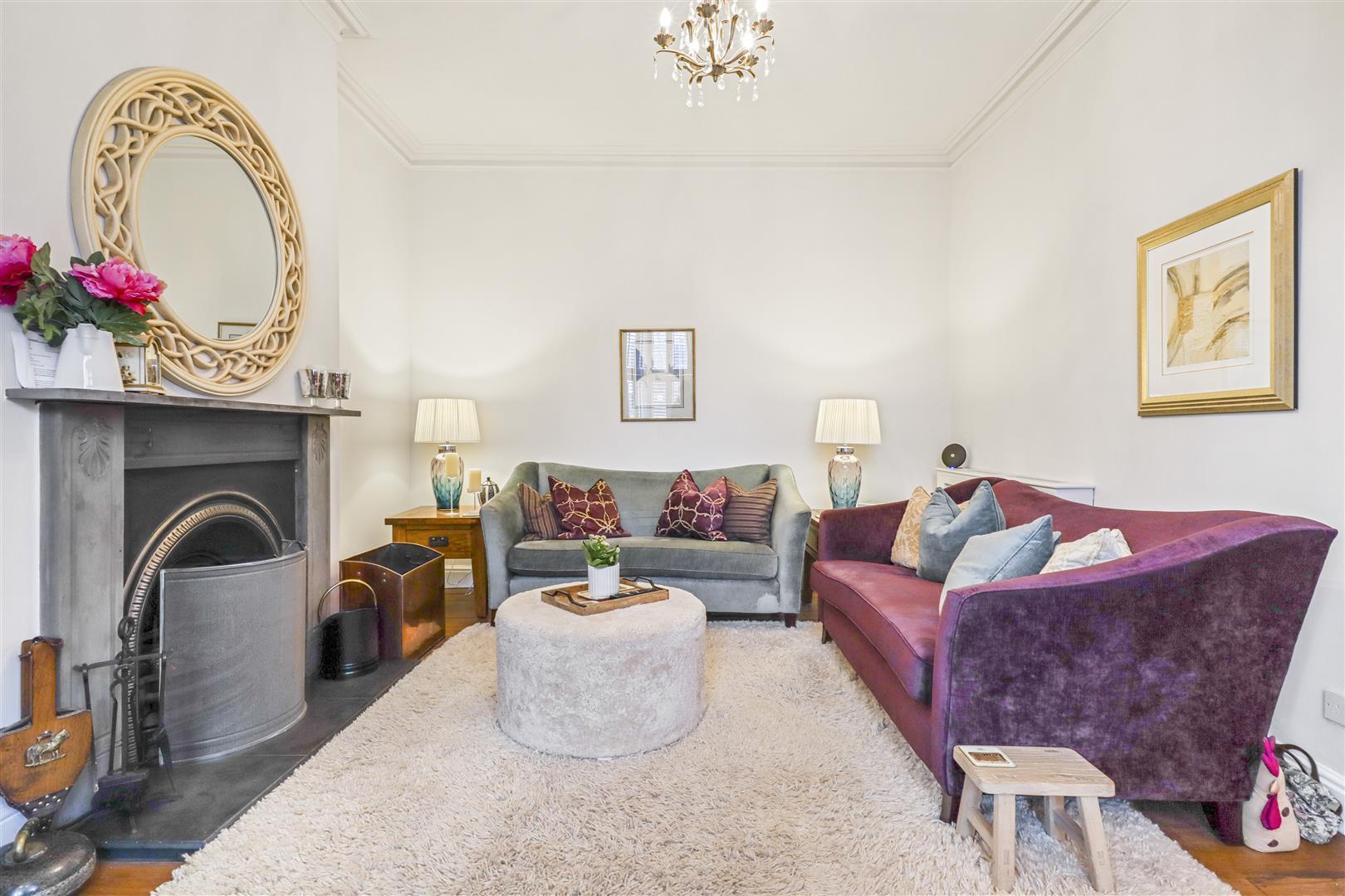 Coving to ceiling, original oak floor boards, Fireplace with slate mantel surround with inset cast-iron inset with matching slate hearth, front feature bay window with secondary glazing, window seat, plantation shutters, 5 amp lighting circuits with dimmer light switching.