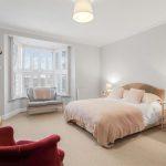 To front with feature front bay with secondary glazing, built-in window seat and plantation shutters, and two down lights above, coving, corner walk-in dressing closet with hanging rails and shelving, original mantel surround with Georgian inset grate, radiator within fitted radiator cover and additional radiator, door to