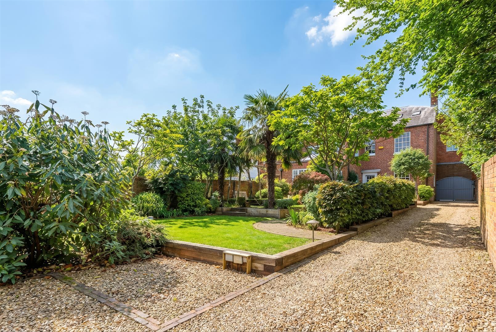 The house is set back from the road behind a lower brick curved wall with wrought iron railings with matching central pedestrian gate and side opening. There is a York stone path leading to the front door with two external lantern lights and an original boot scrape. The front is laid to gravel for ease of maintenance with planted front hedging with bluebells beneath.