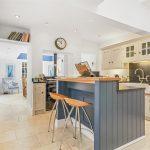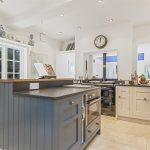 Travertine marble floor, radiator, custom built and painted units with riverbed granite work surfaces with matching upstands, central island housing the Neff combination microwave oven and twin plate induction hob, bin and tray storage and incorporating an oak perching bench, fitted units with cupboards and drawers with matching wall units and glazed display cupboards, tall matching pantry cupboard with fitted shelving, double recessed Belfast oversized sink with brushed nickel mixer tap, integrated Miele dishwasher, integrated large refrigerator. Black three oven gas fired AGA, twin side spice/herb cupboards, corner unit with pull out shelves, extractor fan, down lighting, side window and opening leading into the