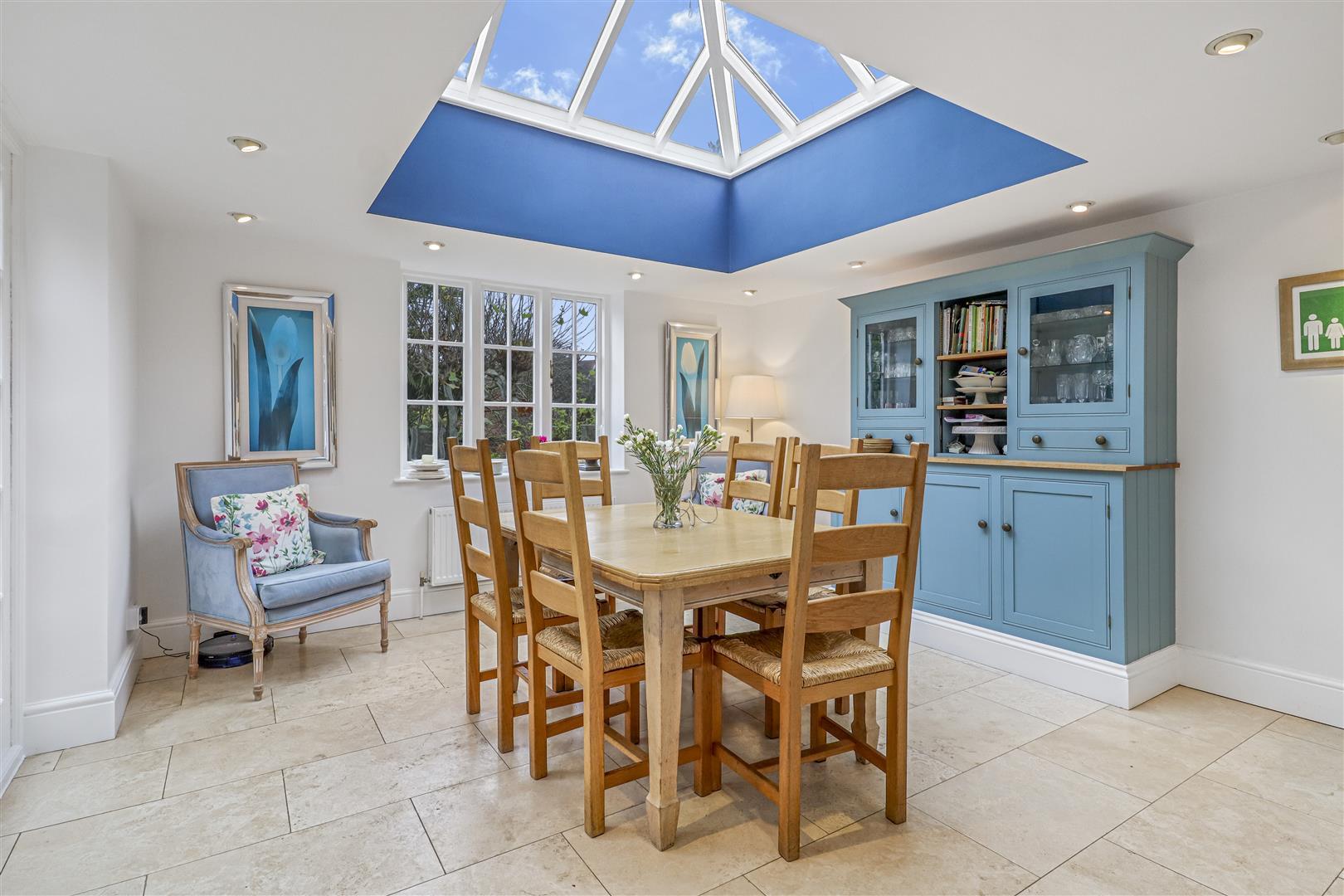 Travertine marble flooring, ceiling down lighting, radiator, double glazed feature central lantern, recessed lighting, matching dresser unit to kitchen with oak shelf, cupboards, drawers and glazed display cabinets. Multi-paned window overlooking the rear garden and twin glazed doors to side patio.