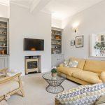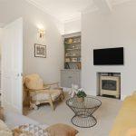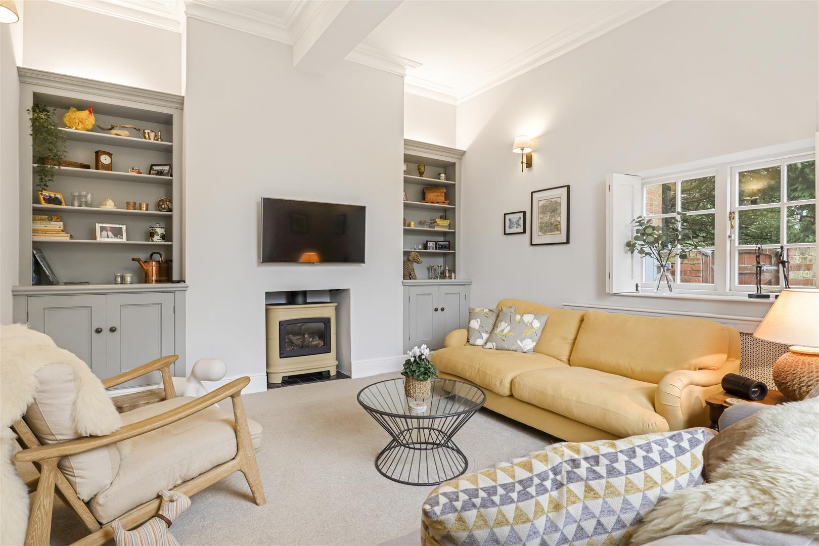 Chimney breast with wall mounted TV position and beneath an inset Gazco ceramic remote control living flame stove, twin built-in shelving units with cupboards beneath and recessed lighting above, coving, rear sash window with original Georgian sash shutters, side window with further shutters, radiator with fitted radiator cover, original oak floorboards, three wall lights.