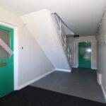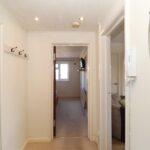 Reception hall with radiator, intercom entry system, LED spotlights, smoke alarm, meter box and coat rail with timber panel doors off to