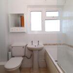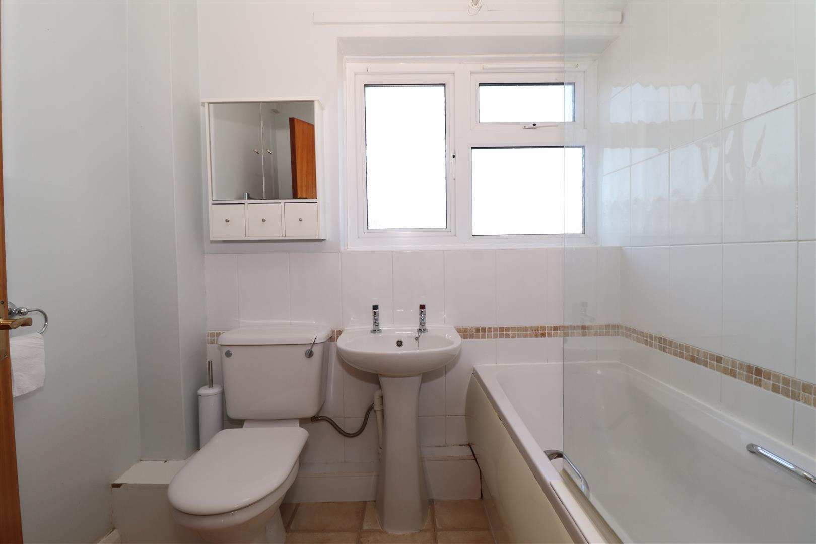 Three piece white suite, with low level w.c., pedestal wash hand basin, panelled bath with shower over and matching chrome fittings, ceramic tiling to walls, opaque double glazed window to rear, central ceiling light, wall hung radiator, vinyl floor.