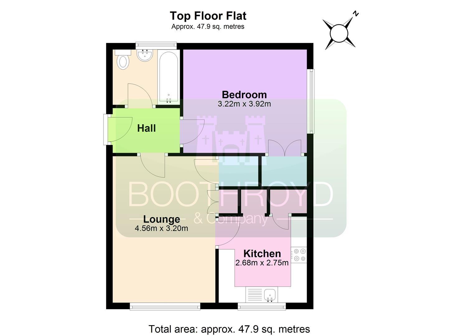 Approached via a communal entrance with stairs up to a top floor apartment with no. 94 entrance door with opaque glazed glass inset.