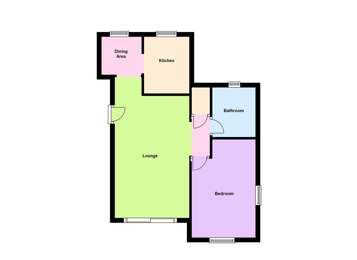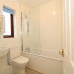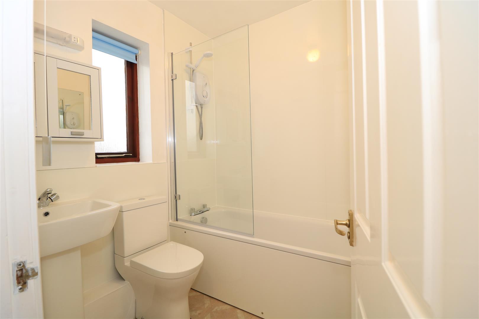 Refitted with a white suite that comprises a panelled bath with electric shower over and shower screen, close coupled wc and pedestal wash hand basin. Heated towel rail. Wall mounted cupboard, dimpled heater, extractor and frosted double glazed window.