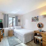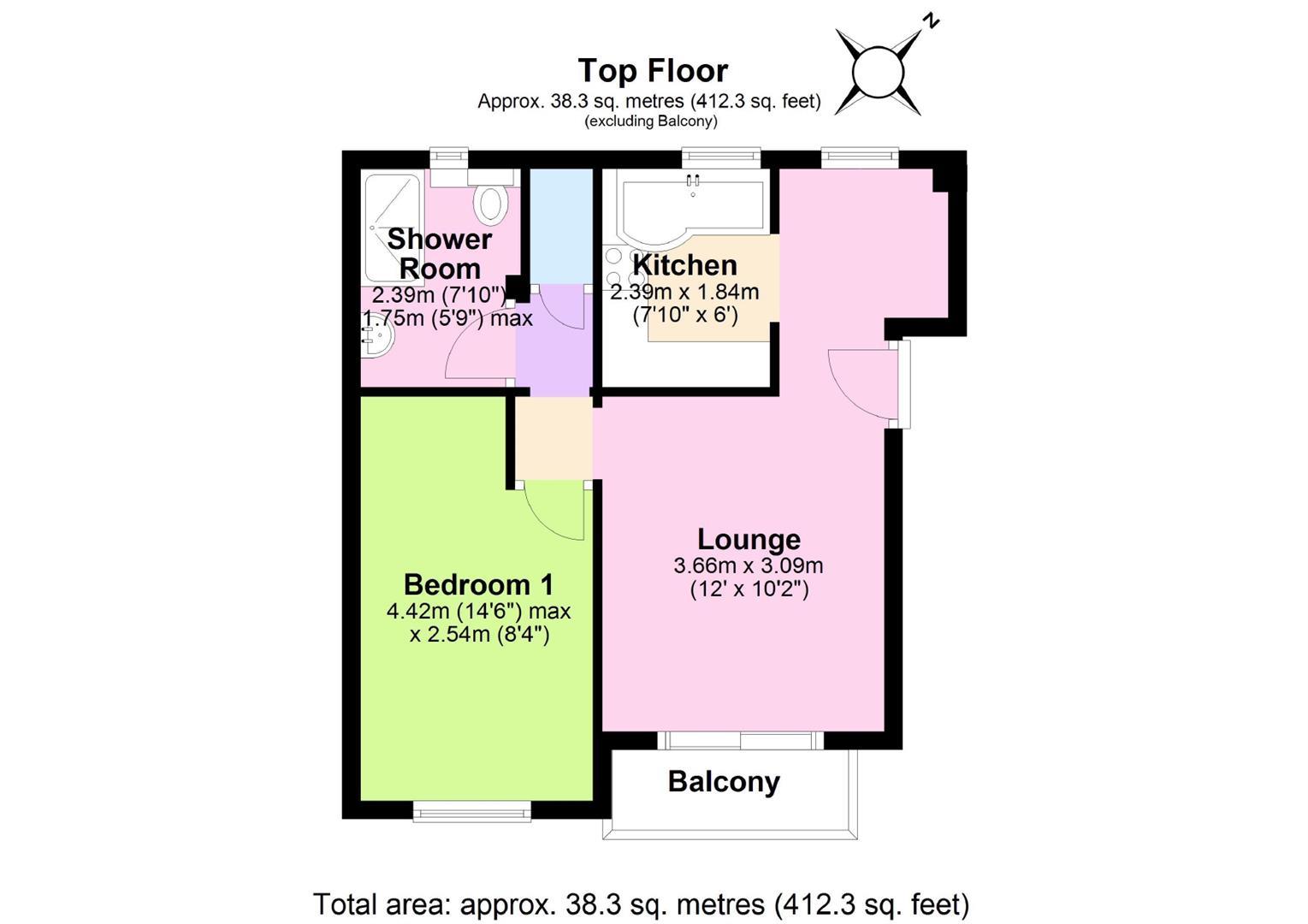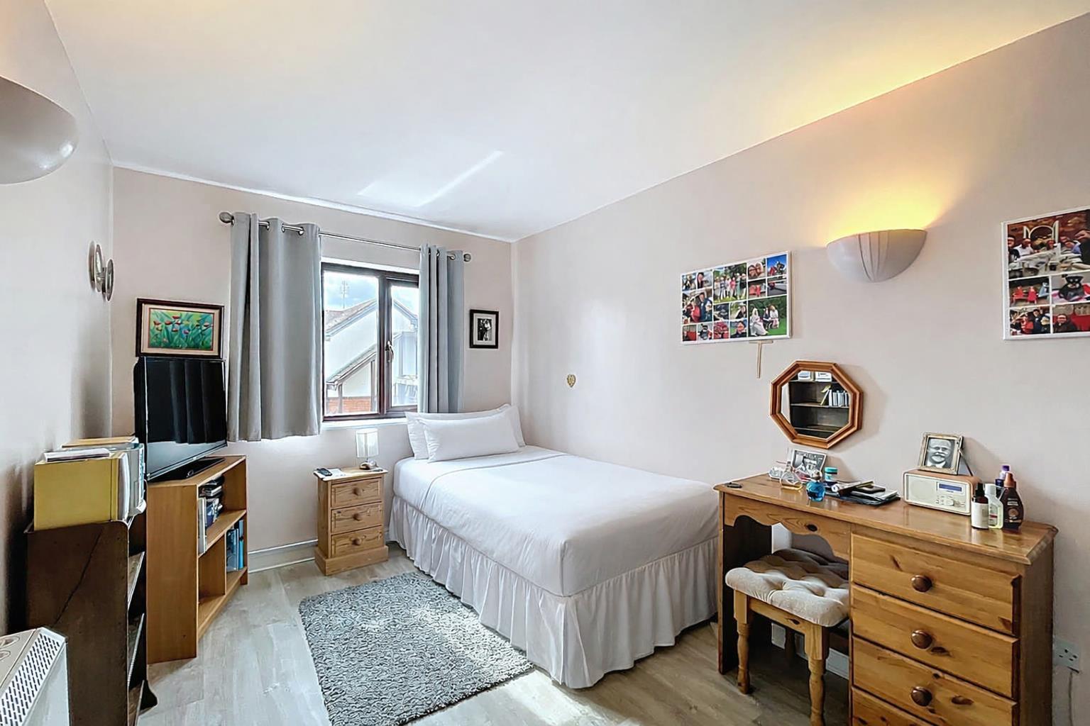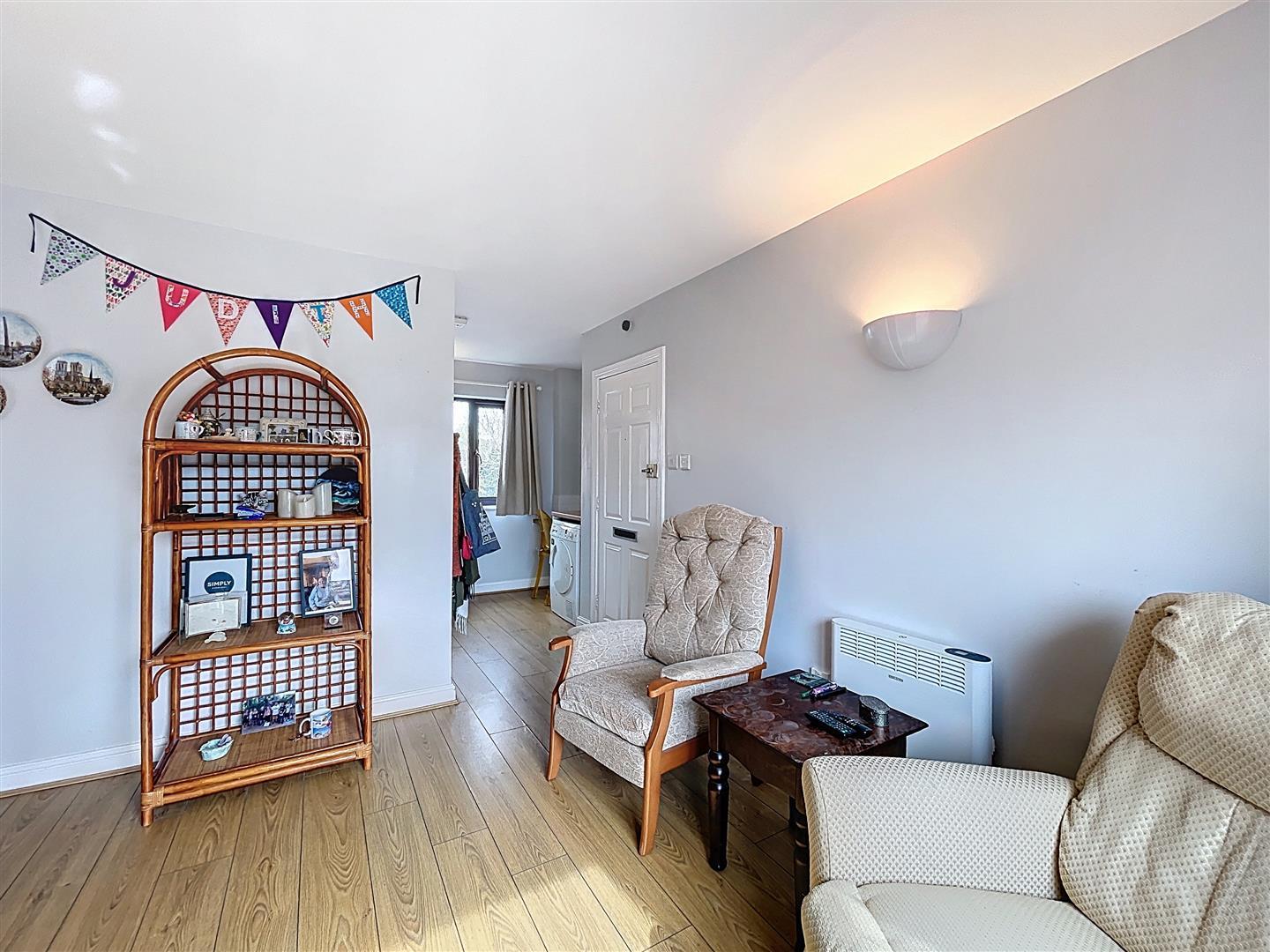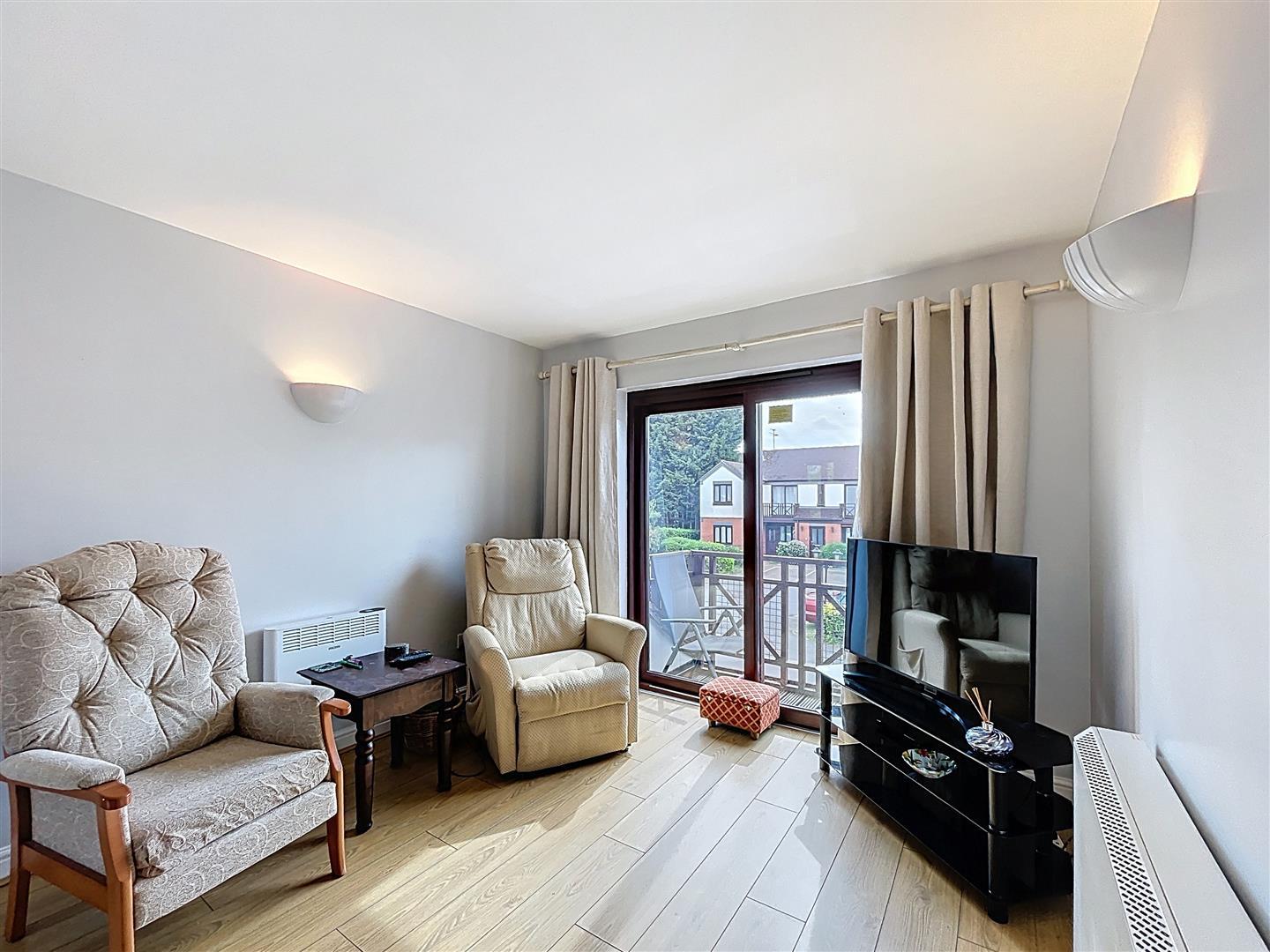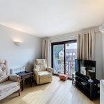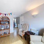 With double-glazed sliding UPVC patio doors leading to the front balcony, two wall lights, an ElecNight storage heater plus an additional boost convection heater, wood laminate flooring, and a TV point, opening to the
