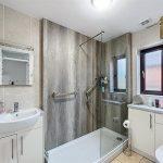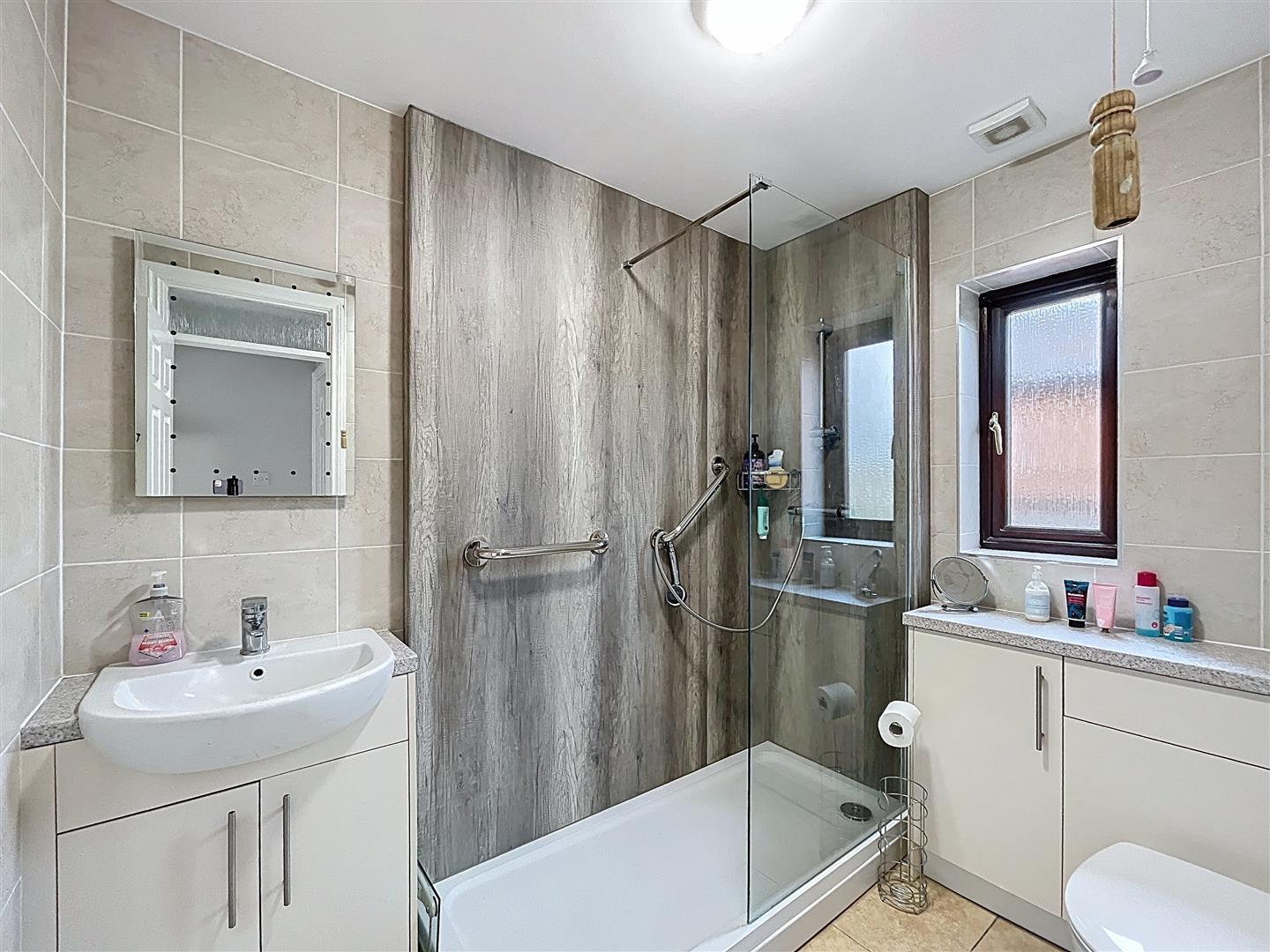 The bathroom features a three-piece white suite that includes a low-level enclosed WC with a storage cupboard to the side. It also has a large walk-in shower enclosure with a fixed glazed shower screen, a mains-fed temperature control shower with matching attachments, grab rails, and easy-to-clean splashbacks. Additionally, there is a vanity wash hand basin with a chrome mixer tap and a cupboard below. The room is enhanced by an LED mirror, ceramic tiling on the floor and walls, a heated chrome towel rail, an extractor fan, and an LED ceiling light. An opaque double-glazed window provides natural light to the rear.