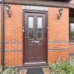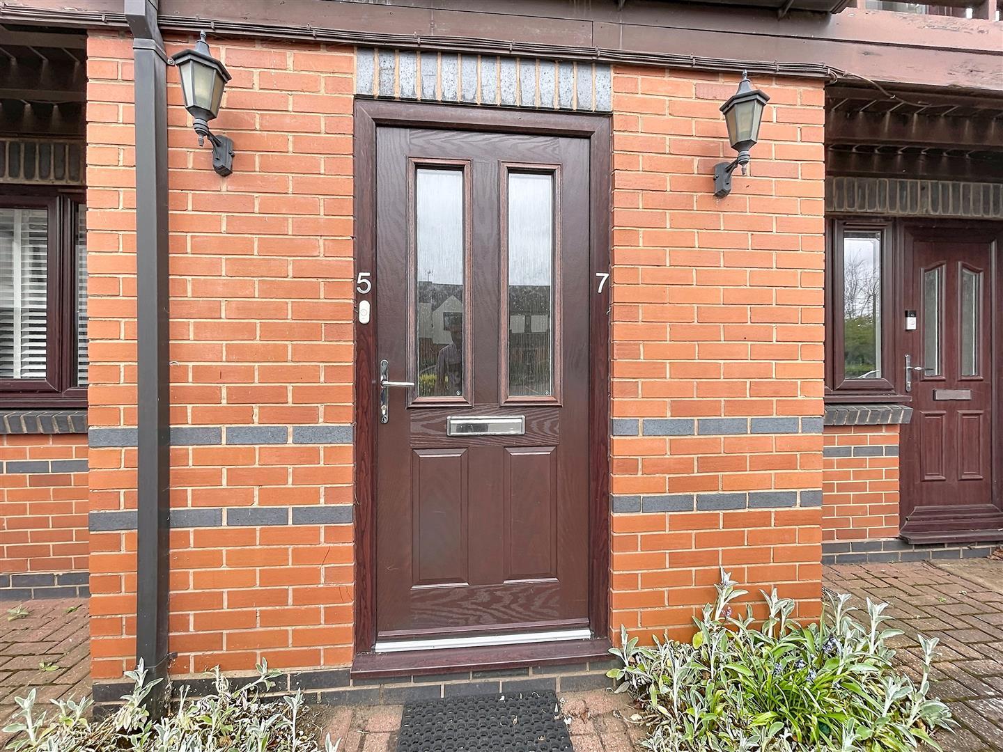 Access to the allocated parking space is via a block-paved driveway leading to a communal UPVC front door for numbers 5 and 7. There are stairs with a ceiling light and a window at the front that lead to the entrance door.