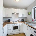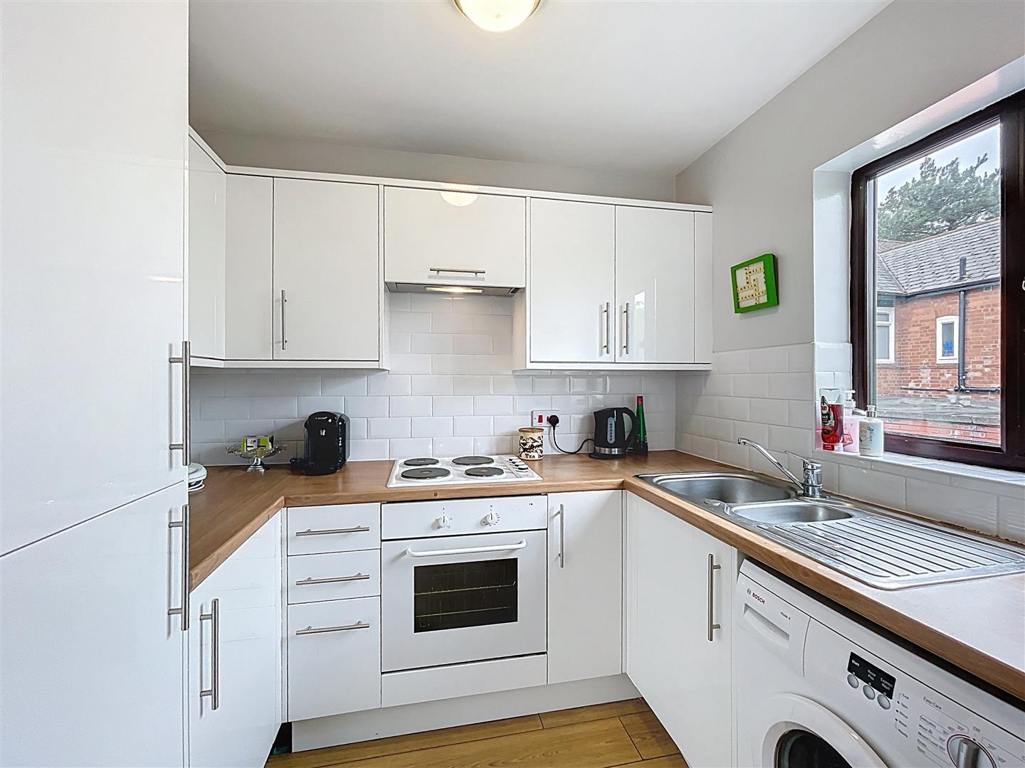 The kitchen features a variety of matching white high-gloss base and wall units, complemented by wood grain effect rounded edge work surfaces. The splashback is adorned with brick bond style ceramic tiles. It includes a single drainer stainless steel sink with a chrome mixer tap, an integrated under-counter fan-assisted oven and grill, and a four-ring electric hob with a concealed illuminated extractor hood above. Additionally, there is an integrated fridge freezer, space and plumbing for a washing machine, and a double-glazed window overlooking the rear.