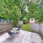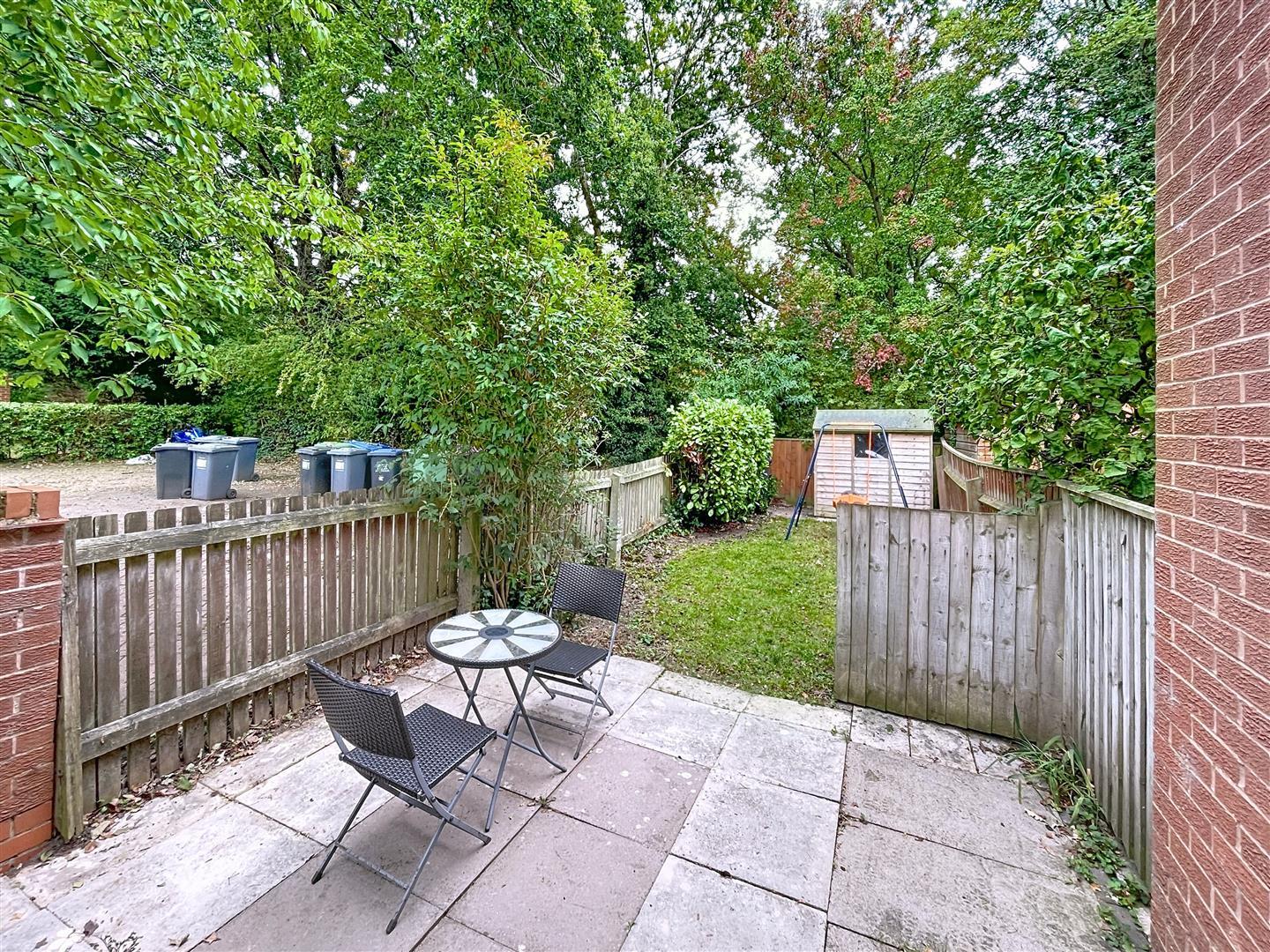 Patio, mainly laid to lawn, enclosed by perimeter fencing, with mature planting.