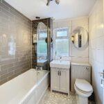 With a reffited three piece white suite with low level encased w.c, matching vanity wash hand basin with cupboard below and central chrome waterfall mixer tap, panelled bath with glazed shower screen, matching chrome waterfall mixer tap, electric shower over bath, grey brick bond style porcelain tiles to floor and walls, heated chrome towel, extractor fan, ceiling spot light, fitted vanity unit with mirror.