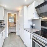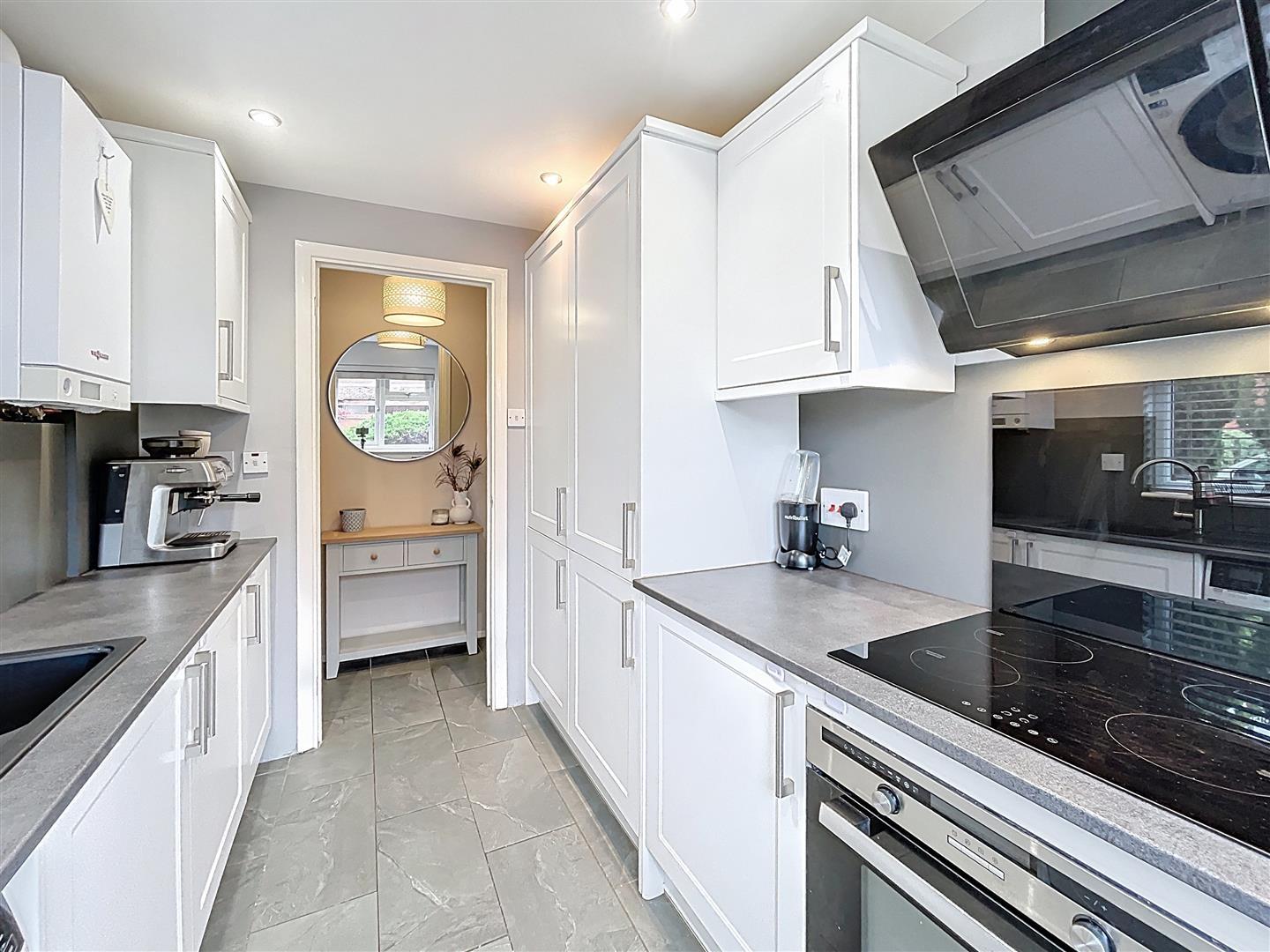 Comprehensively refitted with a range of matching white matt fronted base and wall units with brushed steel handles and 20mm Quartz effect work surfaces with single drainer black composite sink with chrome mixer tap, integrated single fan assisted oven with grill and four ring induction hob with feature illuminated extractor hood over with black glass splashback, space and plumbing for washing machine, wall mounted Viessmann condensing boiler servicing the hot water and central heating, LED downlighters, double glazed windows to front and side, ceramic tiling to floor.