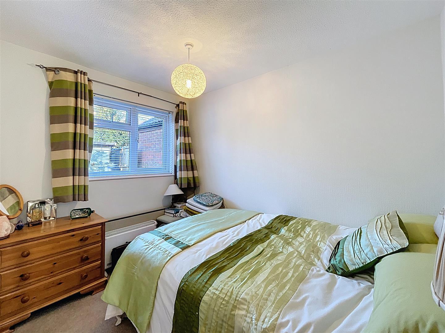 With a window to the rear, built-in wardrobes to recess, with sliding part mirrored and woodgrain effect doors, with twin hanging and shelf, wall-mounted Dimplex Quantim electric sensor-controlled storage heater.