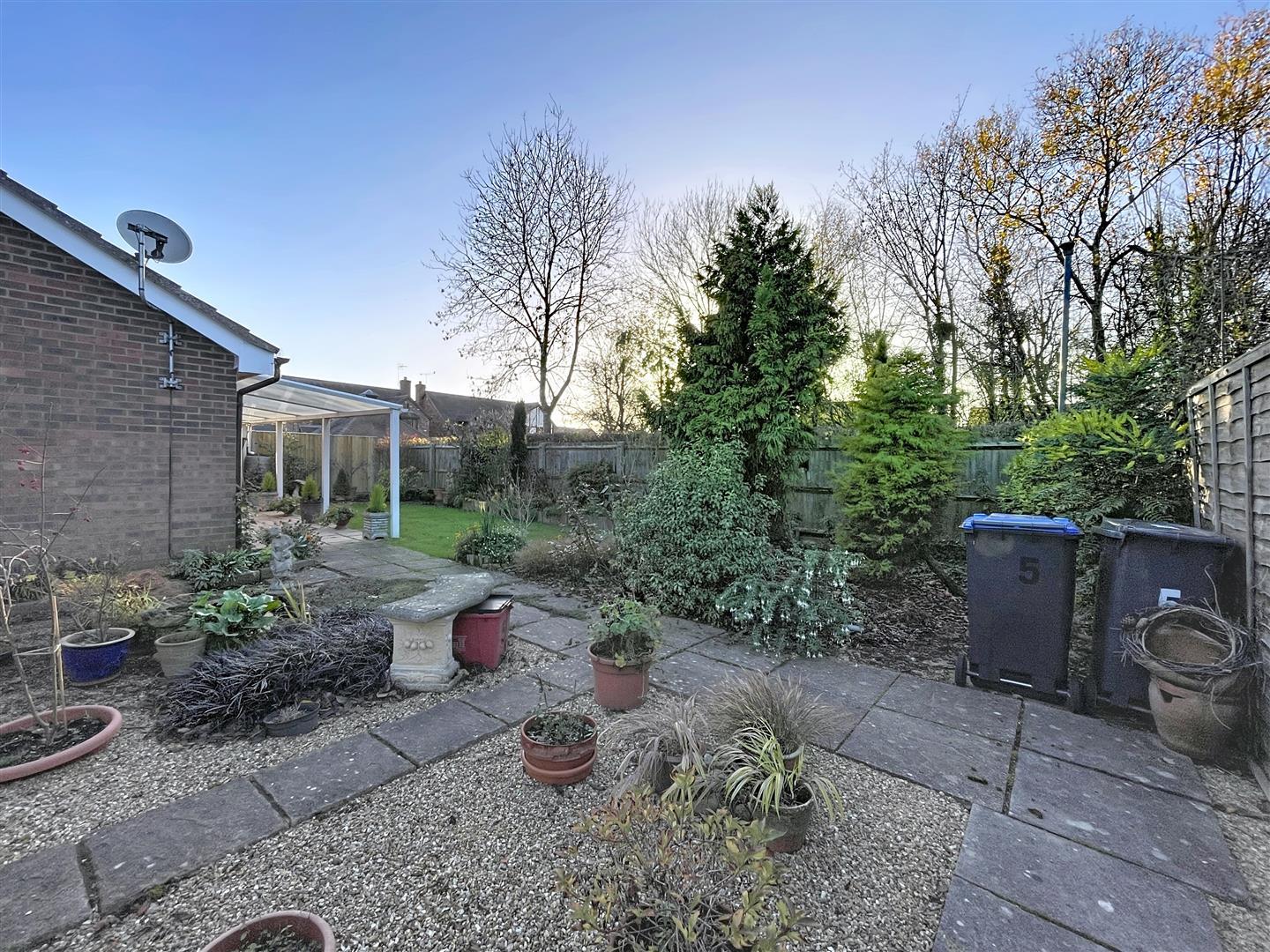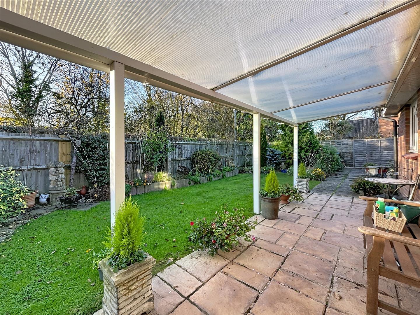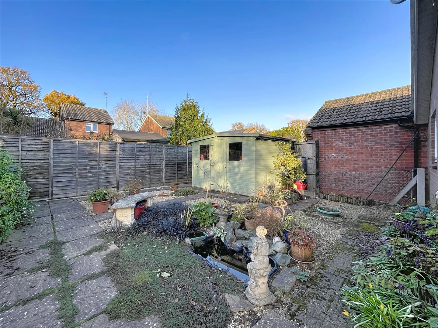 Being an undeniable feature of the property, it is much larger than average, fully enclosed by perimeter fencing. It includes a full-width patio with a white aluminum veranda and a polycarbonate roof, an outside power socket, and a cold water tap. There is also an attractive lawn with railway sleeper-edged raised flower beds featuring a lovely variety of shrubs and plants, a small tree, a garden pond, a rockery, and a water butt.