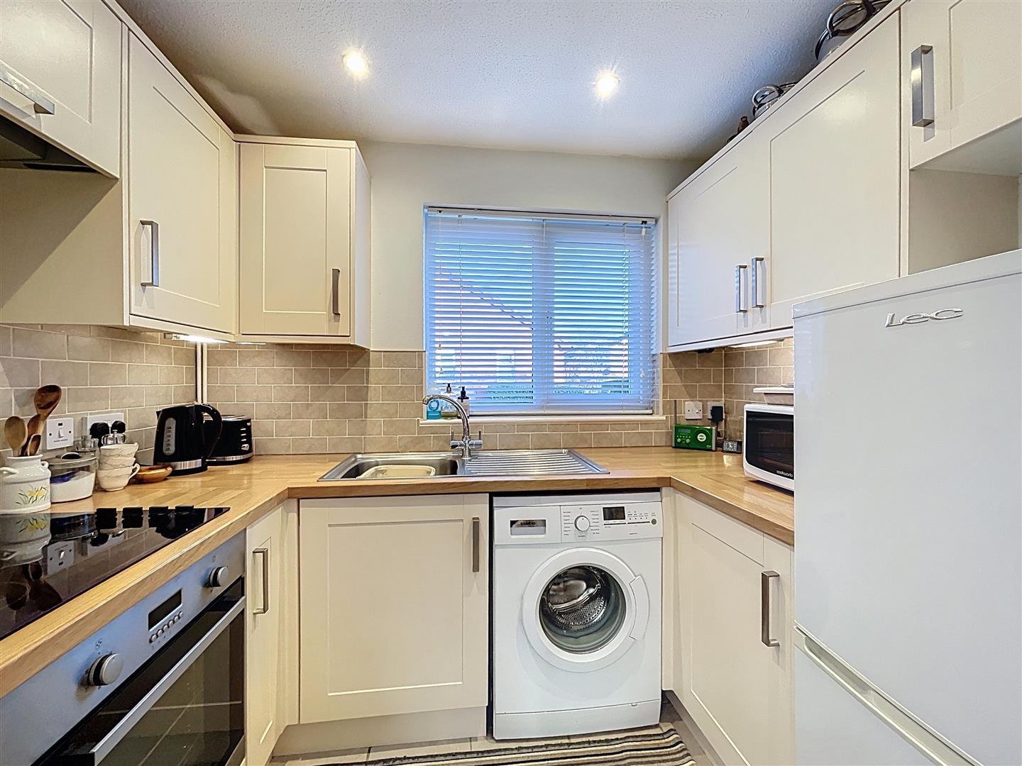 Comprehensively fitted with matching cream shaker-style base and wall units, featuring wood grain effect rounded edge work surfaces. Includes a single drainer stainless steel sink with a chrome mixer tap, an integrated Lamona single electric fan-assisted oven and grill, along with a four-ring Bosch induction hob and a concealed illuminated extractor hood overhead. There is space for an upright fridge freezer and plumbing for a washing machine. Ceramic tiling in splash back areas, complemented by under pelmet lighting and LED downlighters. The floor is ceramic tiled, and there is a double-glazed window to the front.