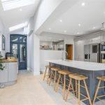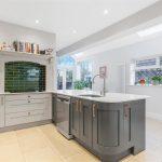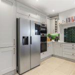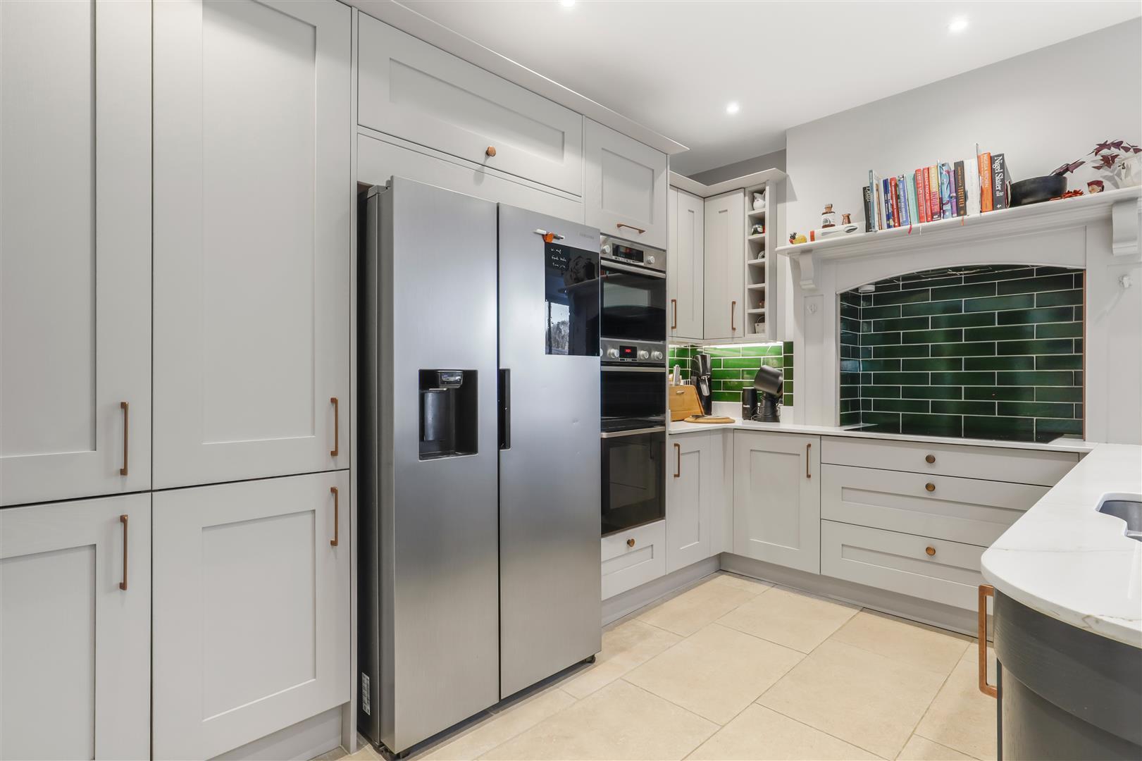 There is space and plumbing for a water-fed American-style fridge freezer and for a dishwasher. The kitchen also features a one-and-a-half bowl under-counter mounted sink equipped with a Quooker boiling water tap and a water filtration system. Additionally, LED downlighters provide ample illumination, enhancing the overall design.