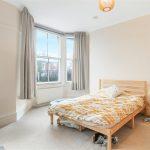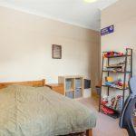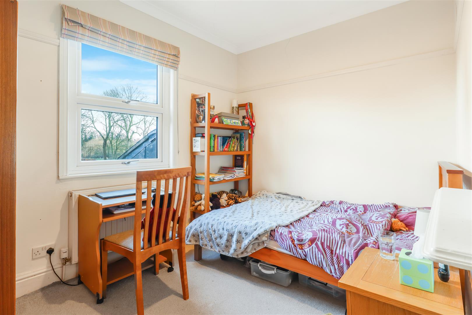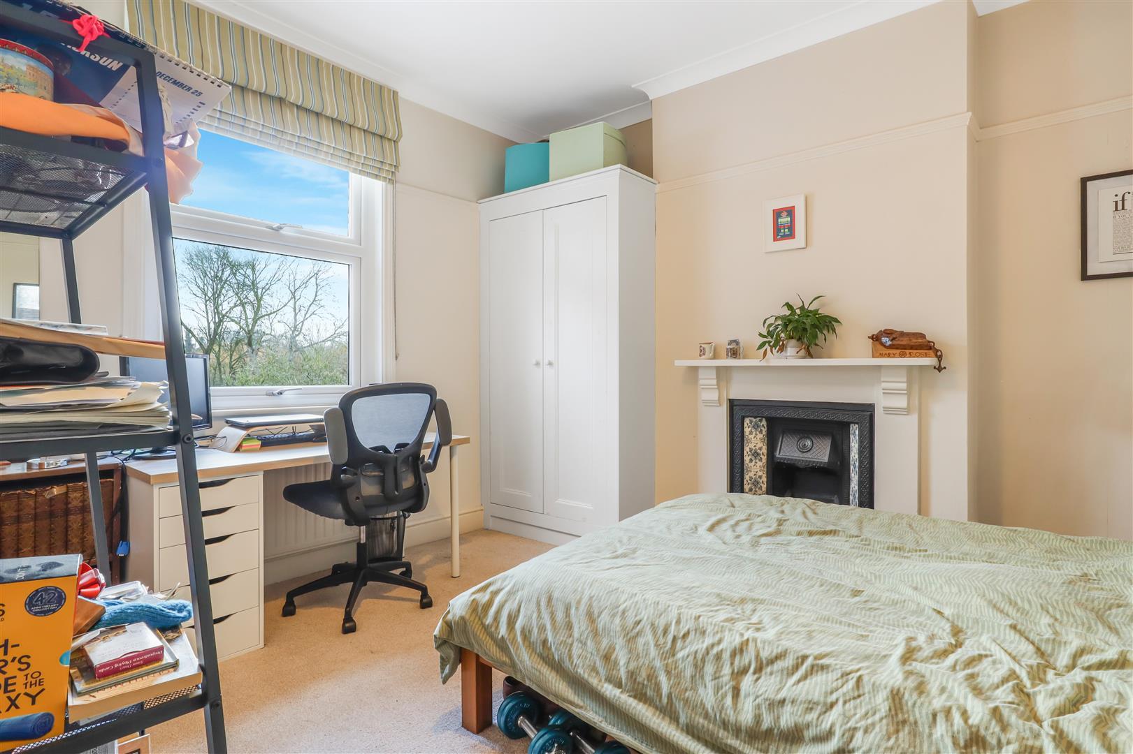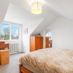 Spacious double bedroom featuring a walk-in dormer window with views over the Abbey Fields. It includes a Victorian radiator, ceiling light, smoke alarm, access to the roof void, and a door to the