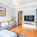 With a radiator and a bay window to the front featuring secondary glazing, this room boasts coving, a ceiling light, and a smoke alarm. A striking recessed wood-burning stove with an oak mantle and stone hearth adds character, while the oak strip floor enhances the aesthetic. Additionally, there’s a feature media wall with a TV point and two shelves.