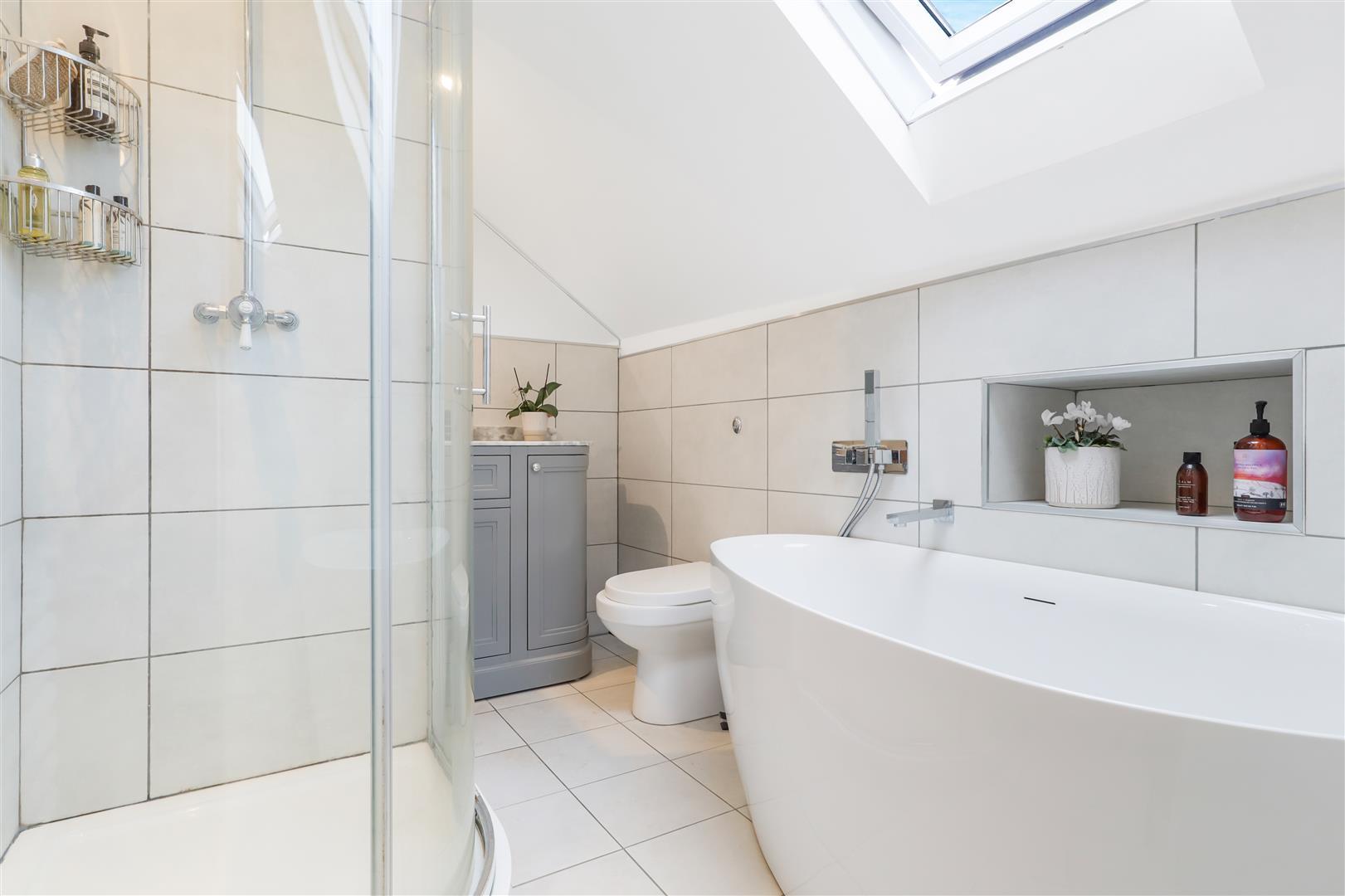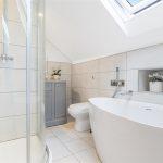 This luxurious four-piece ensuite features a low-level WC, a vanity wash hand basin with a chrome mixer tap, a marble countertop, and an integrated cupboard below. It includes a freestanding bath with wall-mounted chrome mixer taps and shower attachments, as well as a corner shower enclosure equipped with a mains-fed shower and a chrome rain head. Additional features include a heated white towel rail, porcelain tiled floors and walls, an angled mirror, and a Velux window at the rear.
