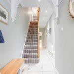 Featuring coving, a ceramic tiled floor, LED downlighters, a smoke alarm, and stairs leading to the first floor, this area includes a range of bespoke handmade under-stairs storage cupboards and drawers with fitted shelving, along with a matching cupboard above. There is also a door to the