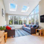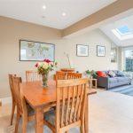 The room features space for a large breakfast or dining table, along with a radiator and LED downlighters. The flooring is ceramic tiled, extending into the family area, which has a striking vaulted ceiling with two Velux windows. There is a radiator and windows that overlook the rear garden, offering views towards the top of Abbey Fields.