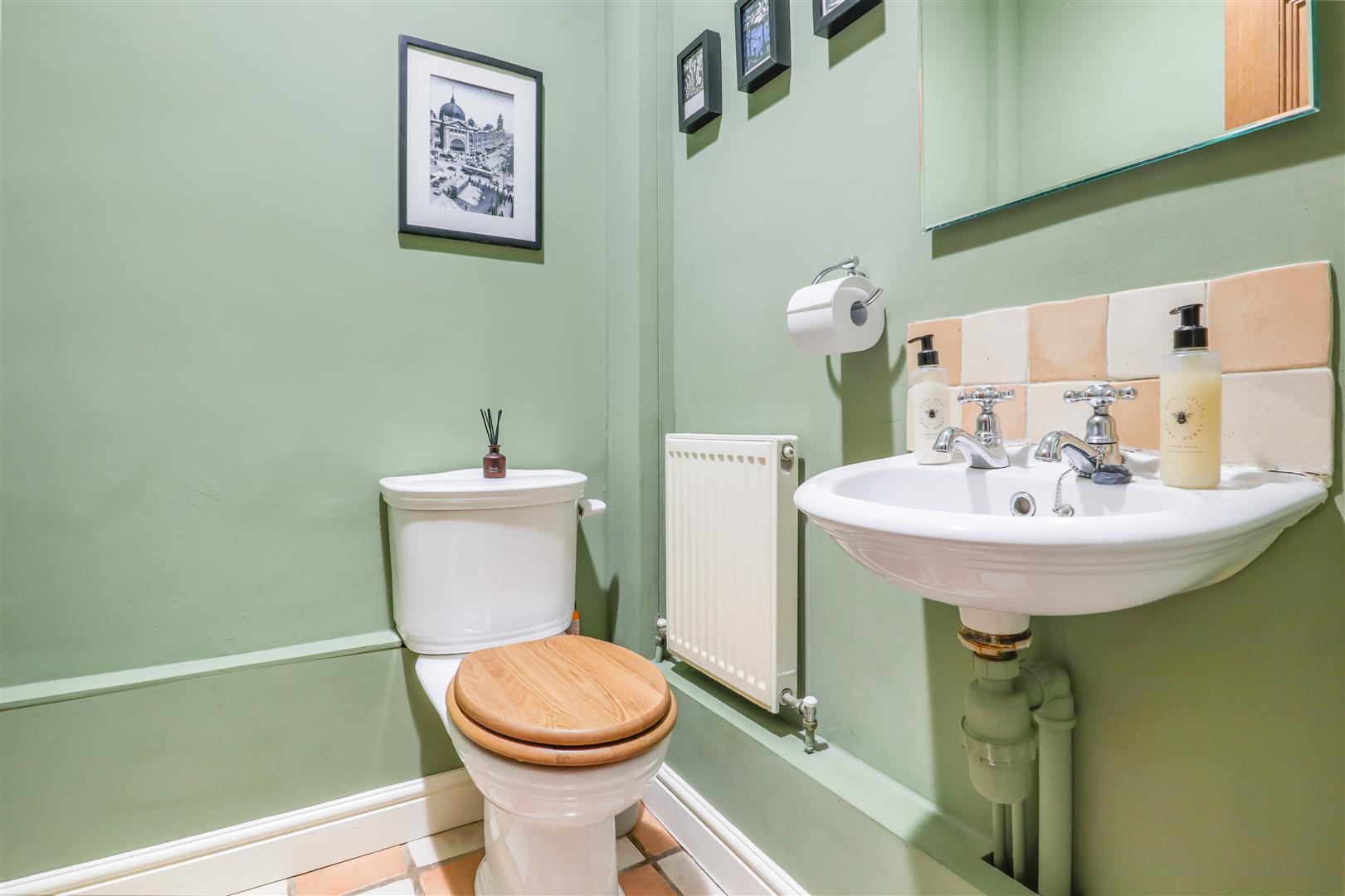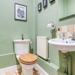 Featuring a two-piece white suite with a low-level w.c., a wall-hung wash-hand basin with a tiled splashback, an LED ceiling light, and a radiator.