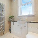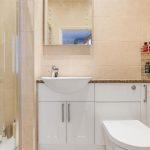 The bathroom features a three-piece white suite, including a low-level enclosed WC, a vanity wash hand basin with a matching cupboard below and to the side, and a chrome mixer tap. There is a walk-in shower enclosure with a mains-fed shower, chrome fittings, and a sliding glazed shower screen. The floor and walls are covered in ceramic tiling, and there is a heated chrome towel rail. Additional features include coving, LED downlighters, and a window on the side.