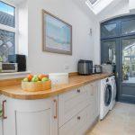 This is a side extension that features three white Velux windows and LED downlighters. It includes a range of additional base cupboards with an oak worktop and matching upstands, providing space and plumbing for both a washing machine and a separate dryer. Other features include an extractor fan, two windows on the side, a vertical radiator, and French doors leading onto the patio, along with an archway to the adjoining area.