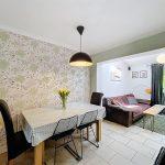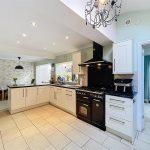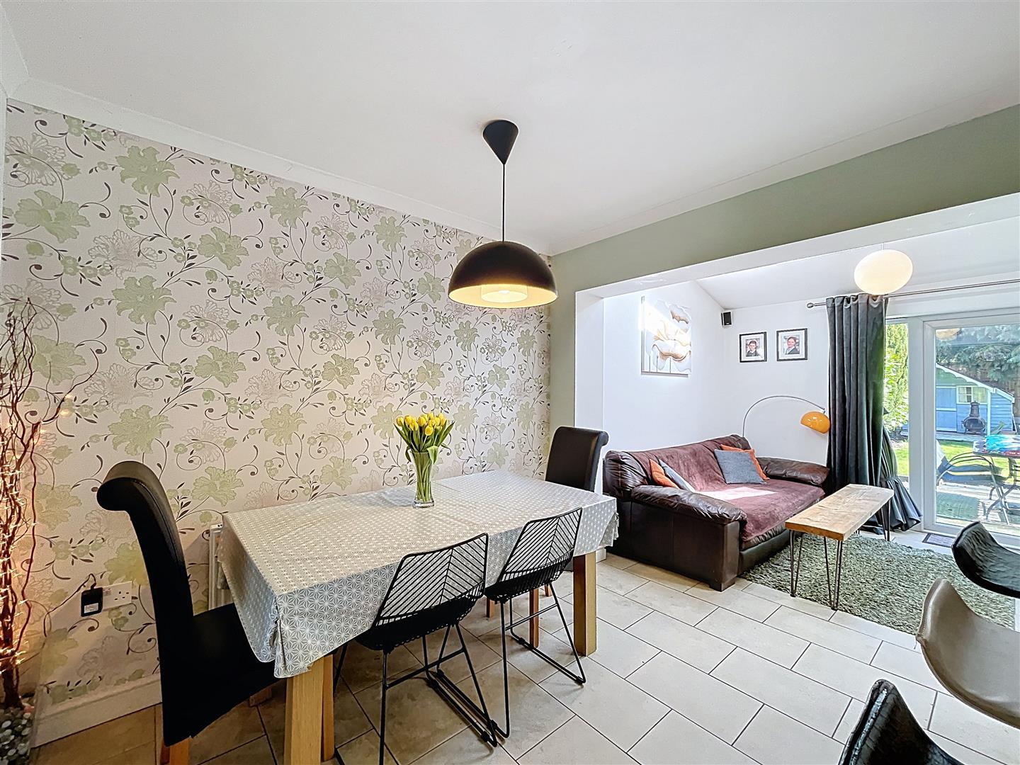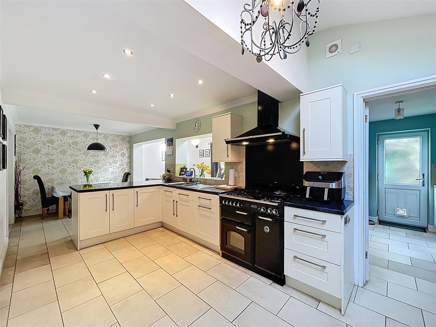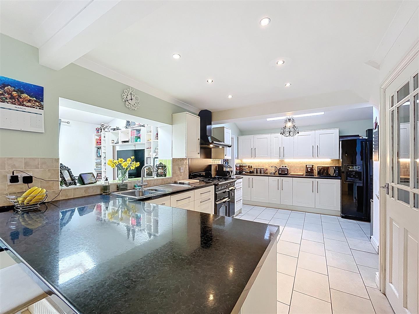 With space for large kitchen/dining table with continuation of the ceramic tiling to floor, radiator, feature wallpaper to one wall, three stool breakfast bar, radiator, arch way through to the