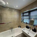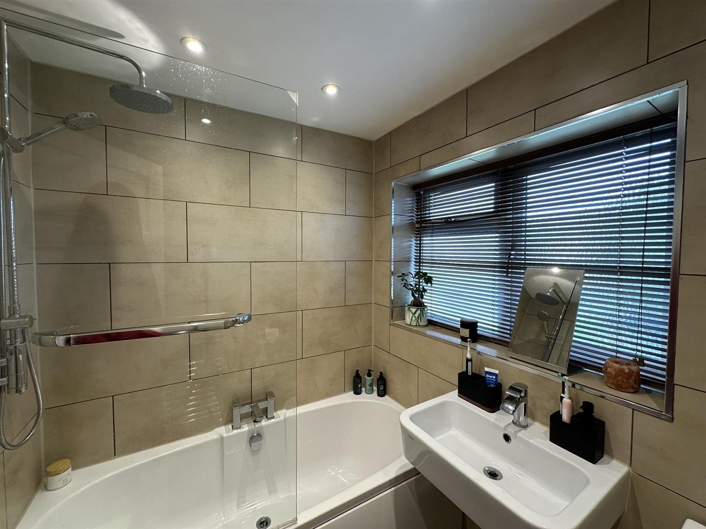 The bathroom features a three-piece white suite, including a wall-hung wash hand basin and a low-level W.C. It has a large, panelled bath with central chrome taps and a mains-fed shower complete with matching chrome fittings. The shower includes an oversized shower head as well as an additional handheld shower. The space is enhanced by a range of ceiling downlighters, and the walls and floor are beautifully tiled. An opaque PVCu double-glazed window overlooks the rear, and there is a wall-mounted heated chrome towel rail for added comfort.