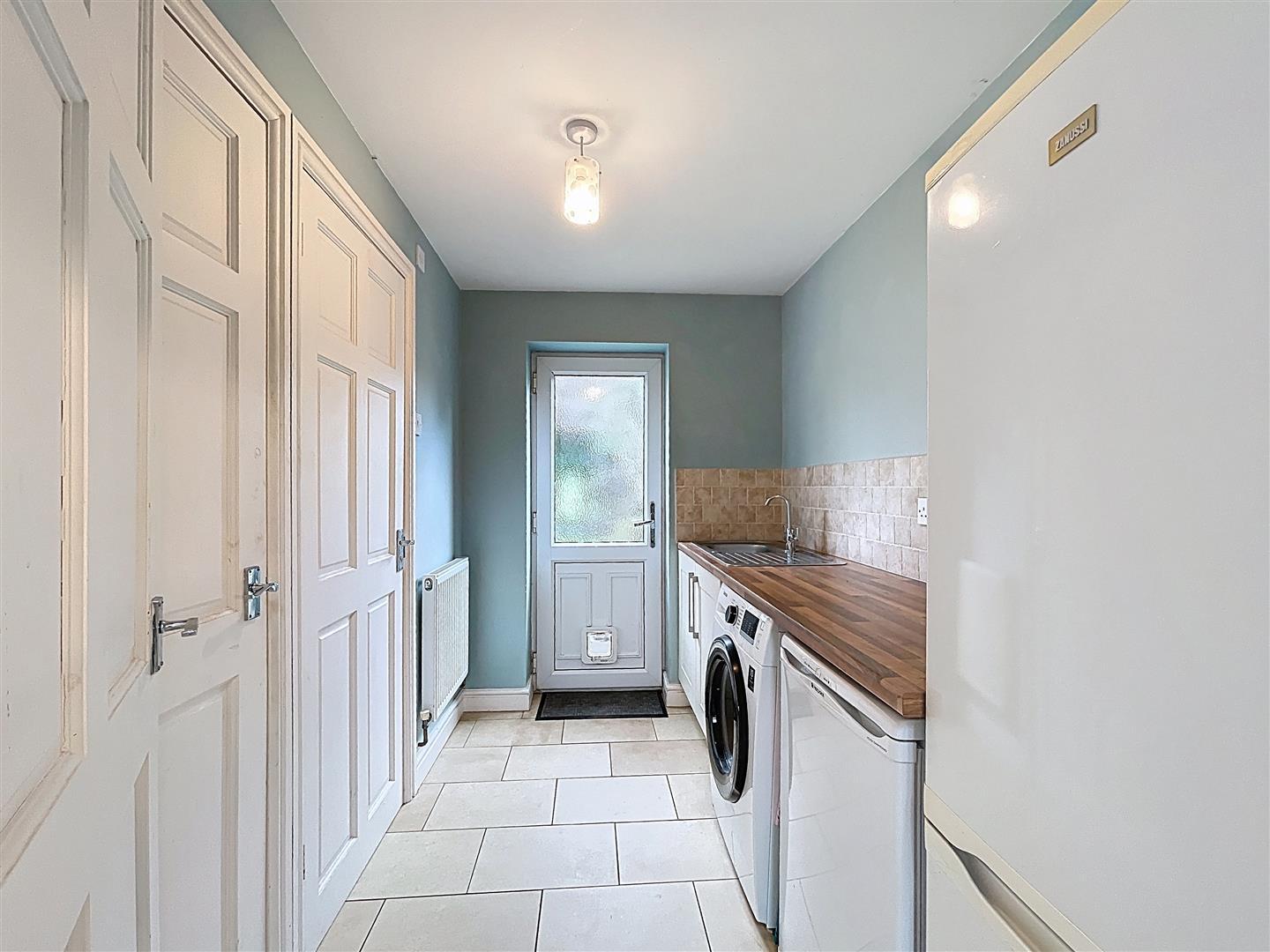 Fitted with a range of matching cream shaker style base units with wood block effect work tops, ceramic tiling to splash back areas, two fitted shelves, space for upright fridge/freezer, space and plumbing for automatic washing machine and space for tumble dryer, single drainer stainless steel sink unit with central mixer tap, radiator, PVCu double glazed opaque door to garden, panelled door to storage/boiler cupboard housing the Vailliant combination boiler servicing the hot waster and central heating, panelled door through to the