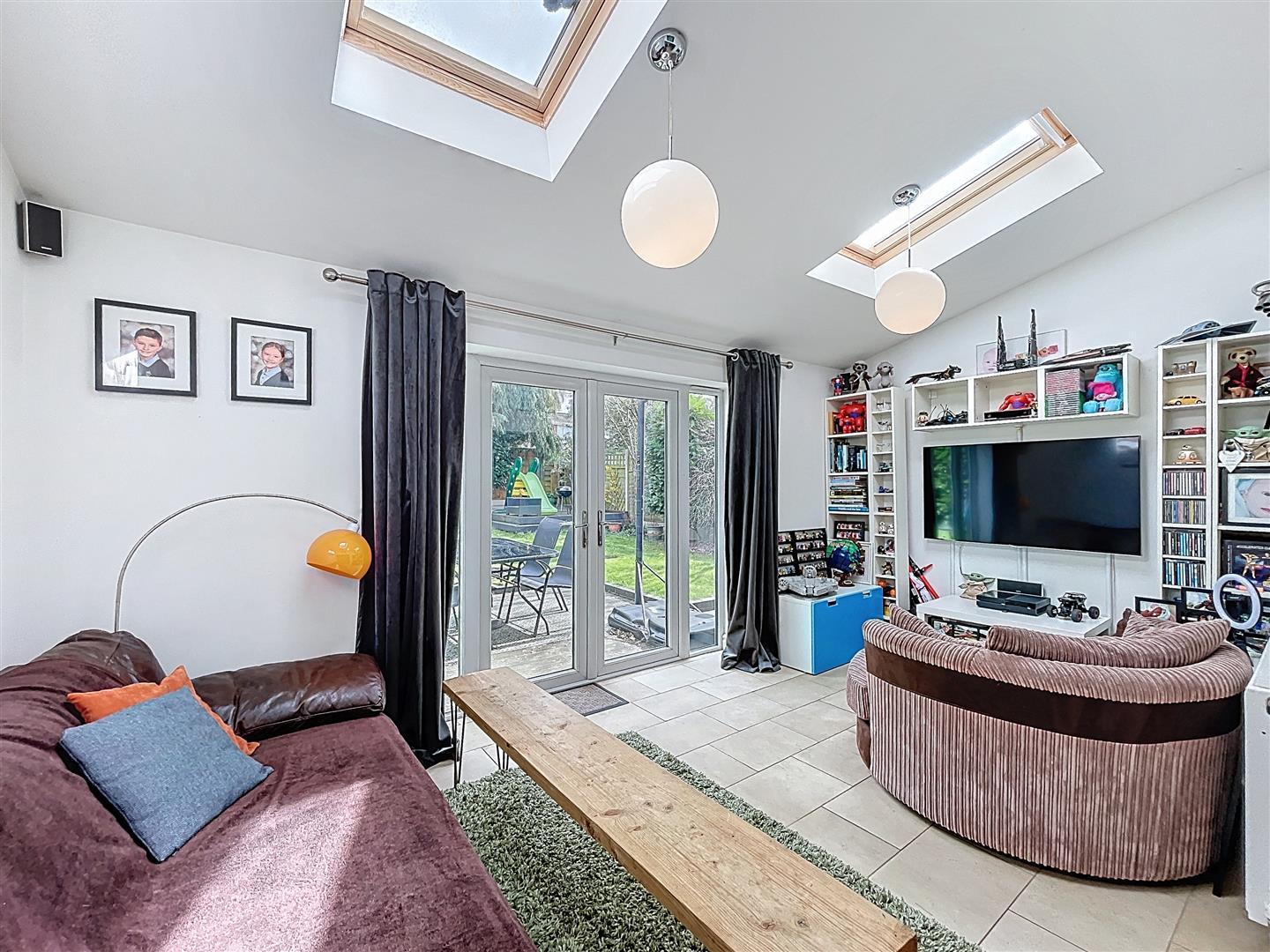 With two large velux roof windows, two ceiling light points, continuation of ceramic tiling to floor, large PVCu double glazed french doors opening to patio and garden with matching full height PVCu insets, t.v. aerial point