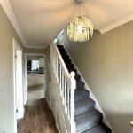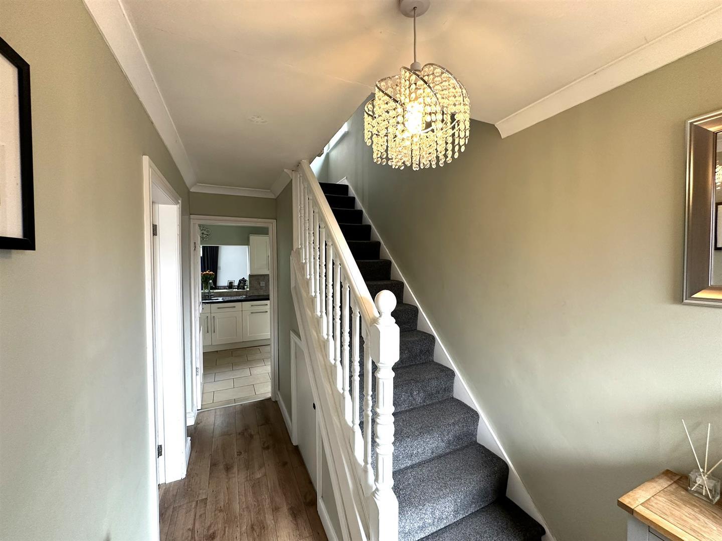 With inset mat well, radiator, coving, central ceiling light, open spindles and banister leading to first floor, useful under stairs storage cupboard with fitted shelving, also housing the electric isolation unit and electricity meter, panelled door through to the
