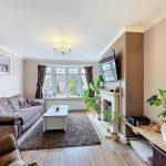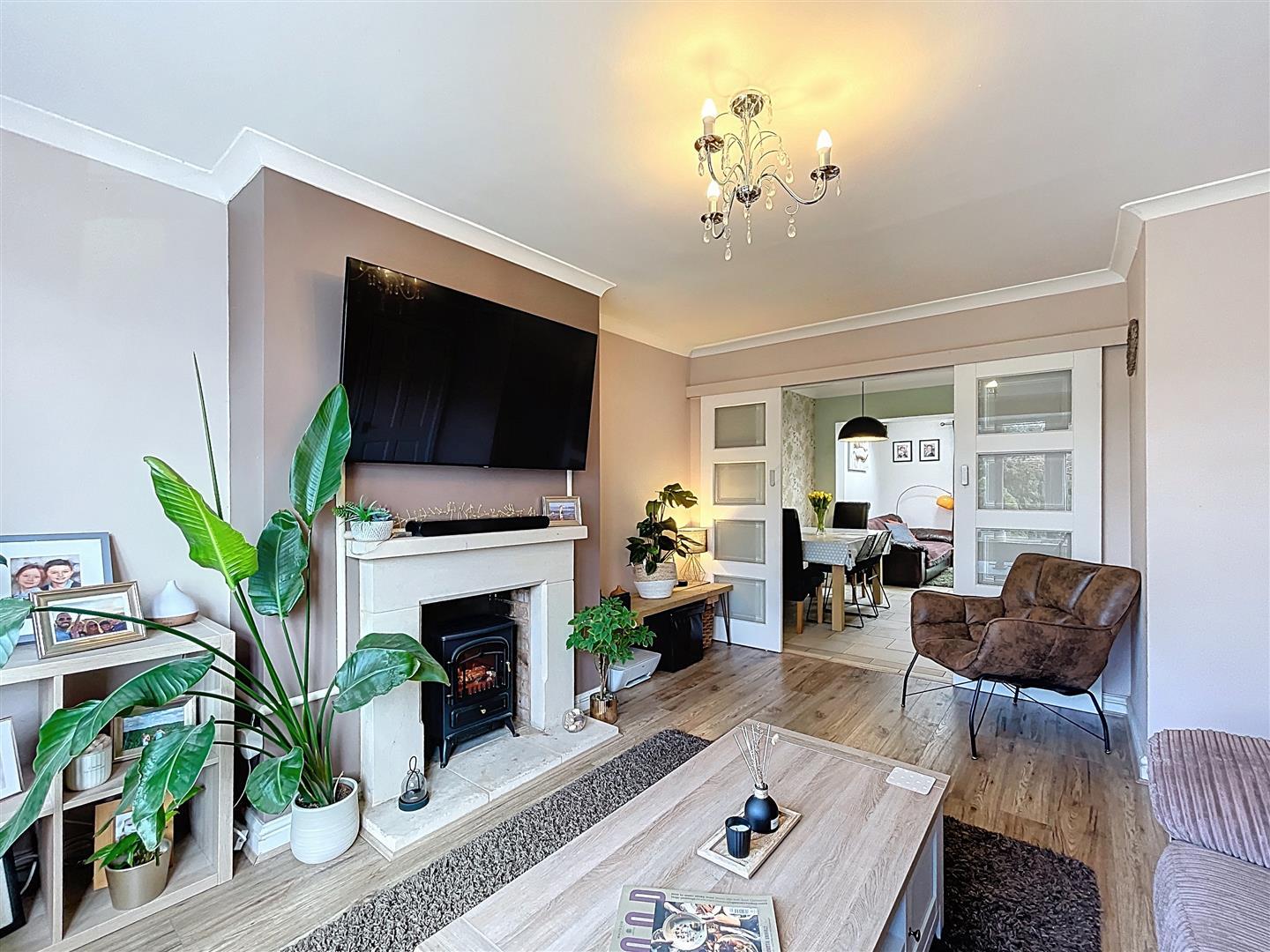 With radiator, PVCu double glazed bow window to front, coving, central ceiling light, feature open grate rear fireplace with matching stone hearth and mantel, coving, central ceiling light, frosted double doors to dining area, t.v. aerial point, panelled and glazed door to the