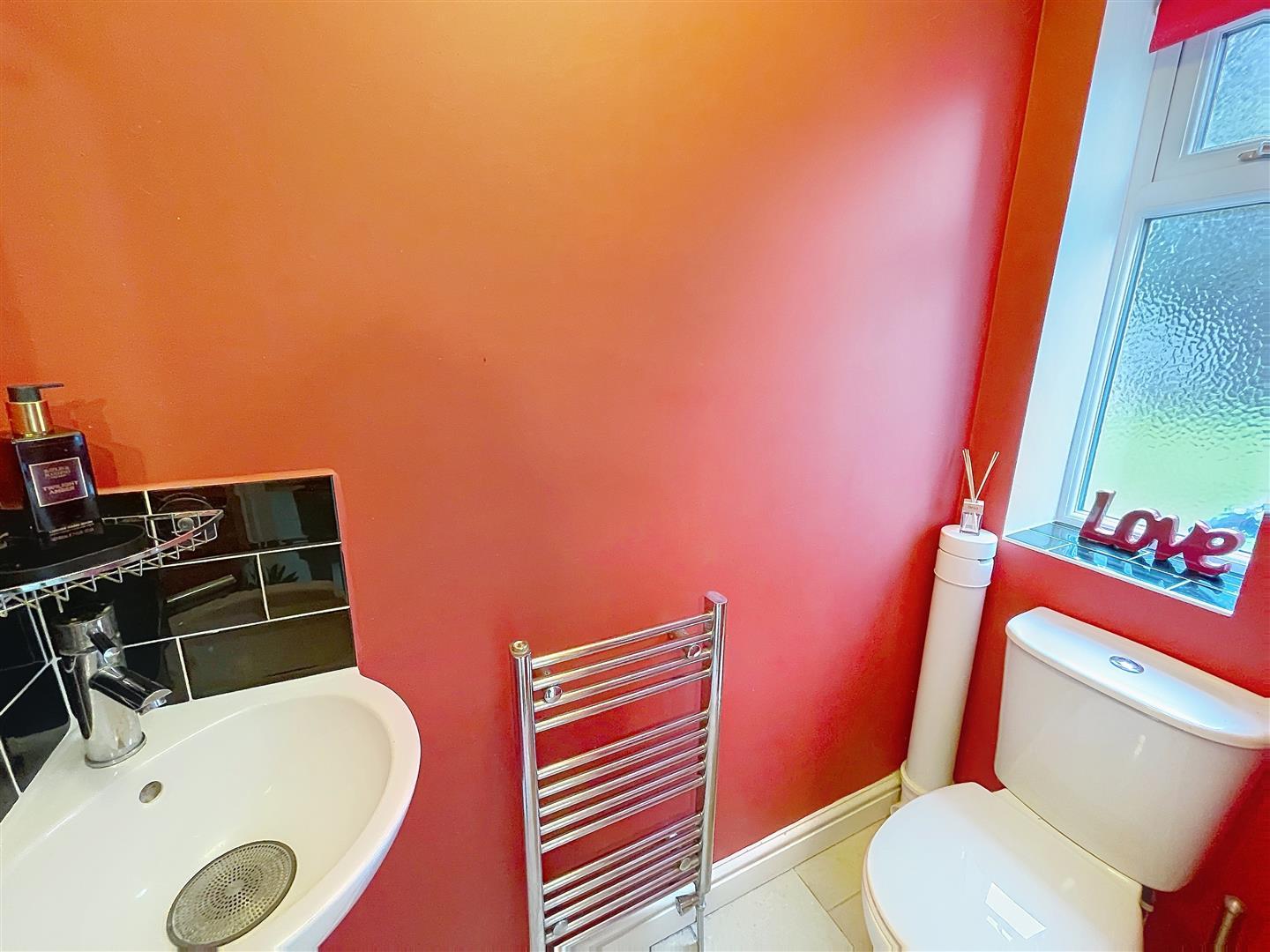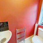 With a low level w.c., corner wash hand basin with ceramic tiling to splash backs, central chrome mixer, half hung pedestal, chrome heated towel rail, opaque PVCu double glazed window, central ceiling light, coving, feature wall light