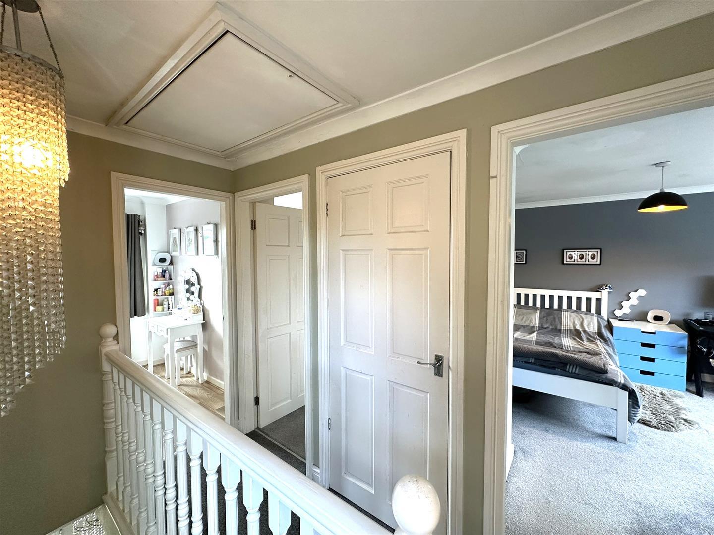 With central ceiling light, opaque PVCu double glazed window to side, matching banister rail and spindles, panelled door to airing cupboard with small radiator, range of fitted shelving, access to insulated loft space with retractable loft ladder, part boarding, fitted light, panelled door through to