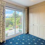Range of built-in bedroom furniture comprising two bedside tables, over-bed storage, two single wardrobes to either side, a further double wardrobe with additional drawers and cupboards, radiator, PVCu double-glazed window, coving, and dado rail.
