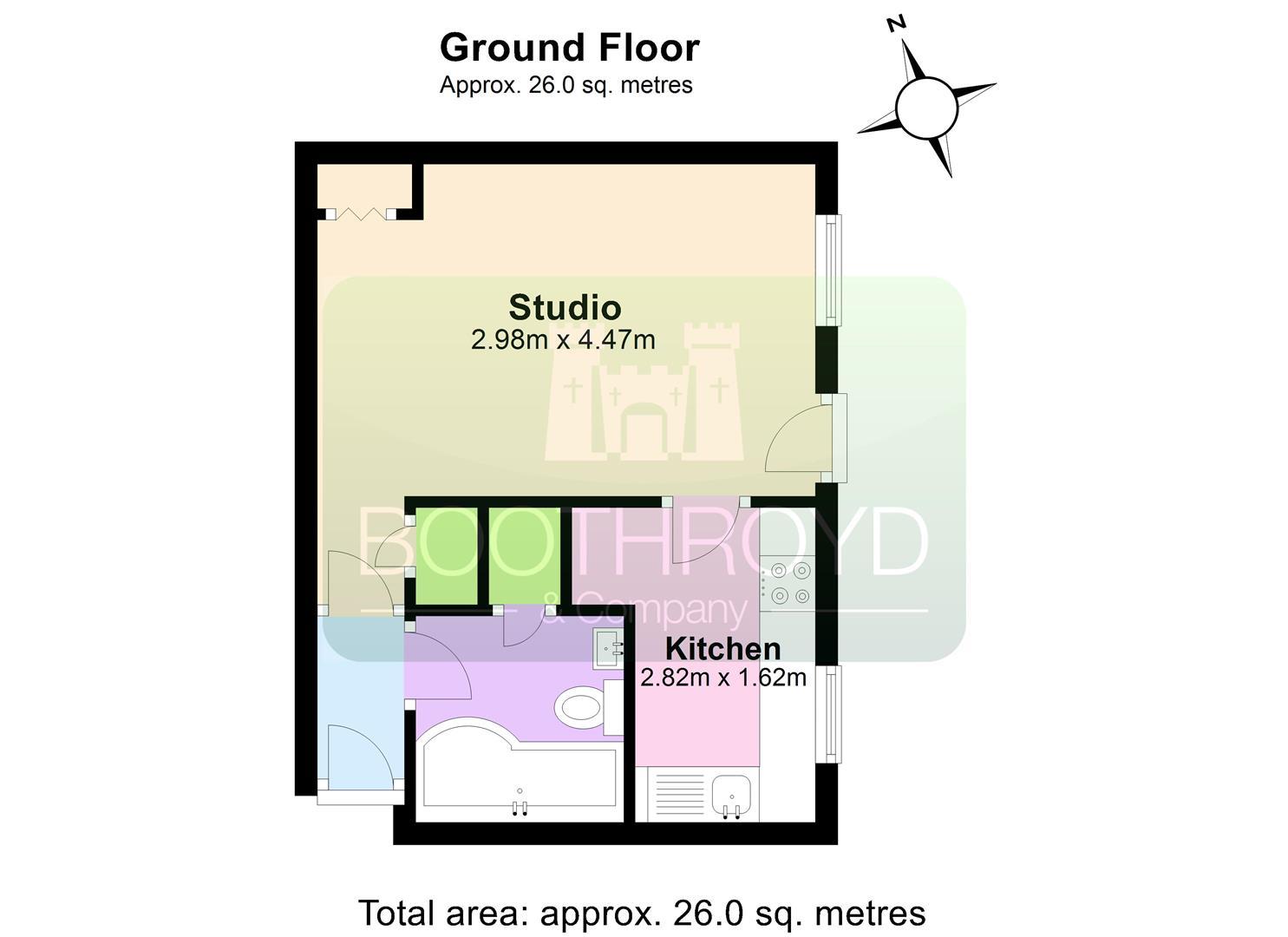 An immaculately presented ground floor studio apartment. With a private entrance door you enter into a reception hallway with doors off to the open plan lounge/studio with built in pull down bed and wardrobe. There is a sofa and breakfast table also. The kitchen has appliances that include a washing machine, fridge freezer, cooker and microwave. The bathroom has a four suite and has an electric shower over the bath. Outside is an allocated parking bay. Available 22nd May 2026