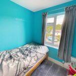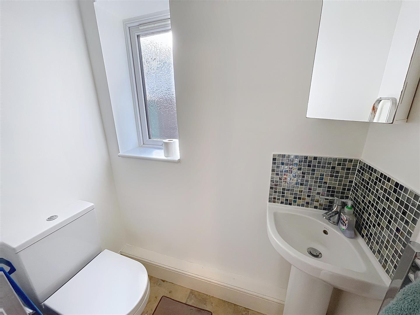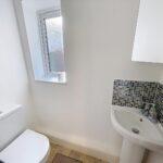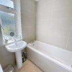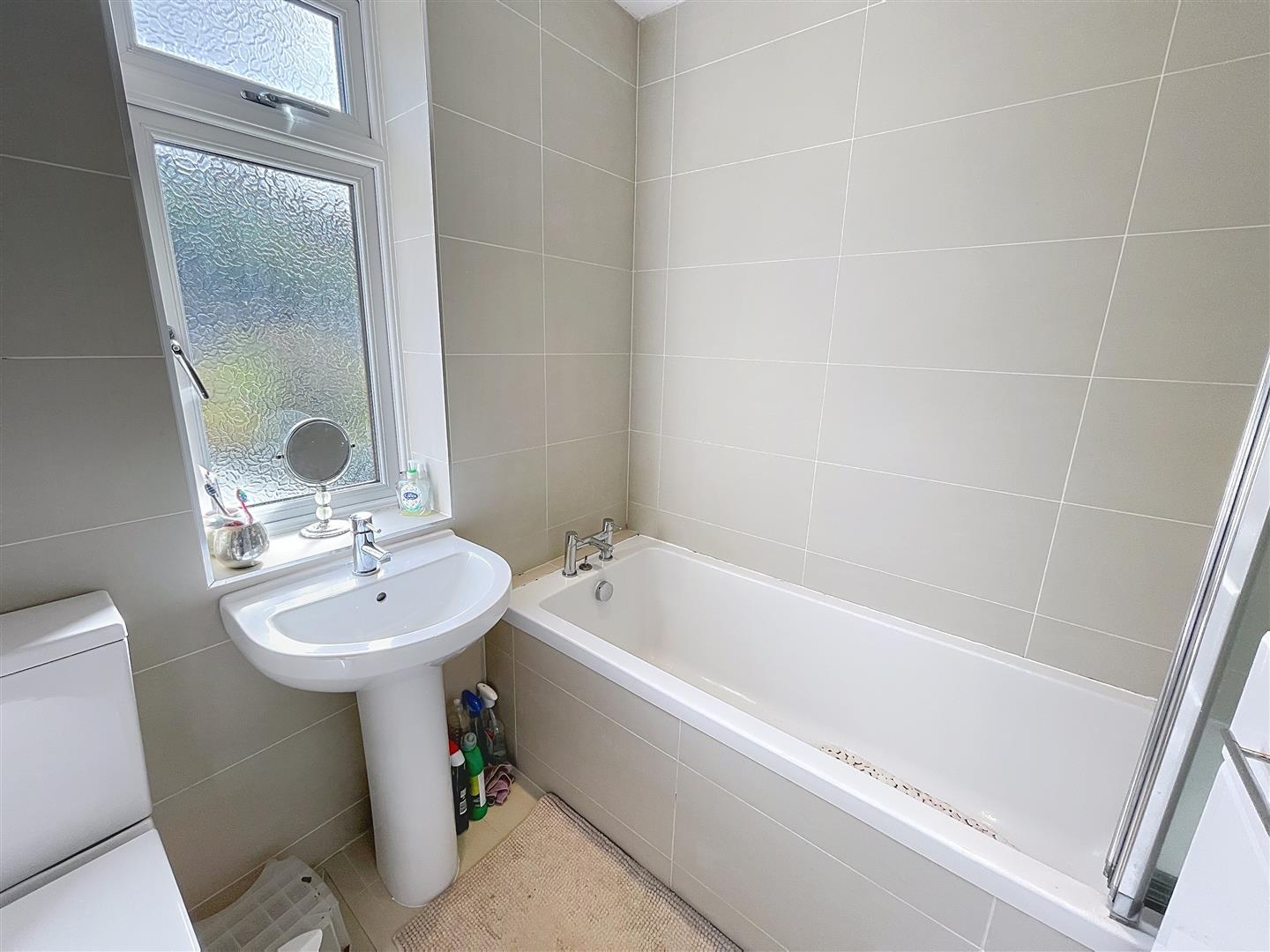 The bathroom features a refurbished three-piece white suite, including a low-level WC and a pedestal wash hand basin with a chrome mixer tap. It also has a panelled bath equipped with a chrome mixer tap and a bi-folding shower screen. The mains-fed, thermostatically controlled shower comes with chrome attachments. Porcelain tiles adorn both the floor and walls, while a heated chrome towel rail provides added comfort. Additional amenities include an LED mirror, an extractor fan, and a window overlooking the rear.
