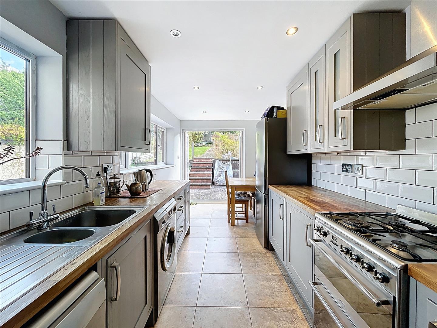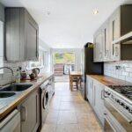 The kitchen area is well-equipped with a variety of Sage green and grey wood-fronted wall units, complemented by solid oak work surfaces. It features a brick bond style ceramic tile backsplash, a Smeg illuminated extractor hood, and space for a 600mm cooker. There is also space and plumbing for both a washing machine and a dishwasher. The floor is finished with porcelain tiles, and the room includes two double-glazed windows on the side, along with LED downlighters. Additionally, there is space for an American-style fridge freezer, leading to the