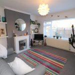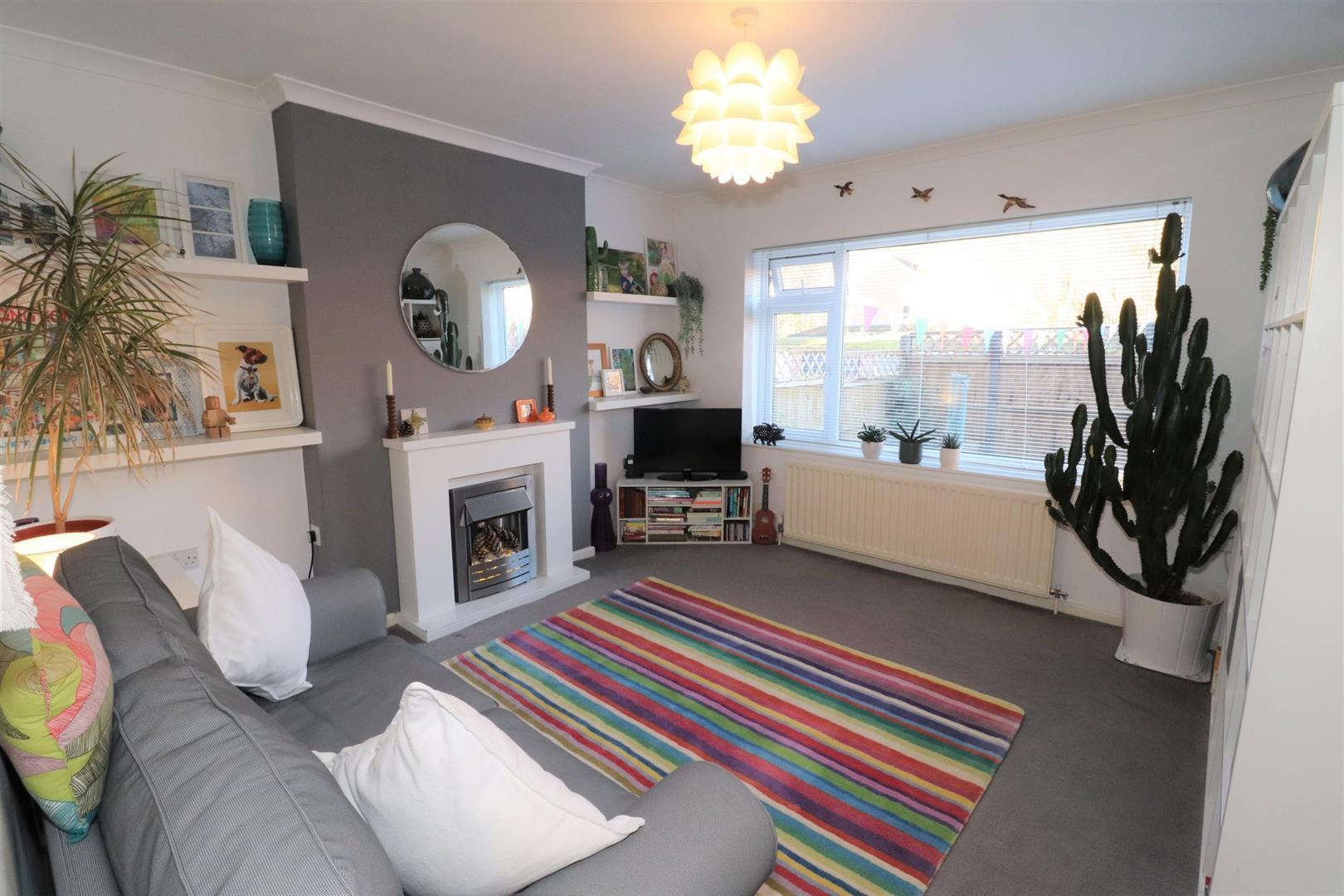 With living flame effect electric fire with pebble inset and marble effect matching insets, surround and mantle, two matching floating shelves either side of the chimney breast, radiator, double glazed window overlooking rear garden, coving, central ceiling light,door way through to the