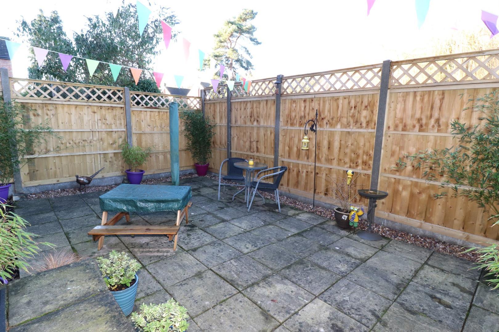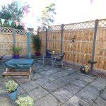 Fully enclosed by new perimeter fencing with additional trellis providing extra privacy, timber side garden gate, outside courtesy light, cold water tap, steps down to a low maintenance patio area with pebble edged finish and access to a side and rear shared driveway leading to a garage en bloc.
