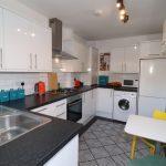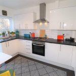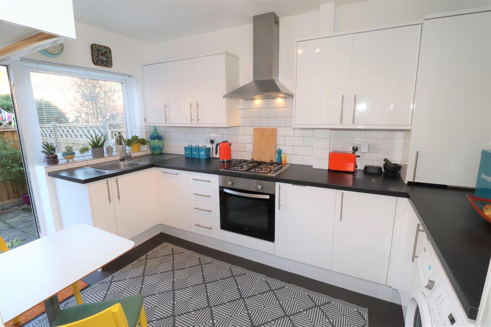 Comprehensively refitted with a range of matching white high gloss fronted base and wall units with stainless steel handles and black marble effect rounded edge work tops, integrated Lamona under counter single electric fan assisted oven with four ring stainless steel gas hob over with illuminated extractor hood above, slimline Lamona dishwasher, single drainer stainless steel sink with chrome mixer tap, space and plumbing for washing machine and large upright fridge freezer, cupboard concealing the new gas meter and wall mounted valliant combination boiler servicing the hot water and central heating, brick bond style ceramic tiling to splash back, vinyl flooring, ceiling light, smoke alarm, heated towel rail, space for breakfast table, double glazed window and door to the rear garden