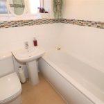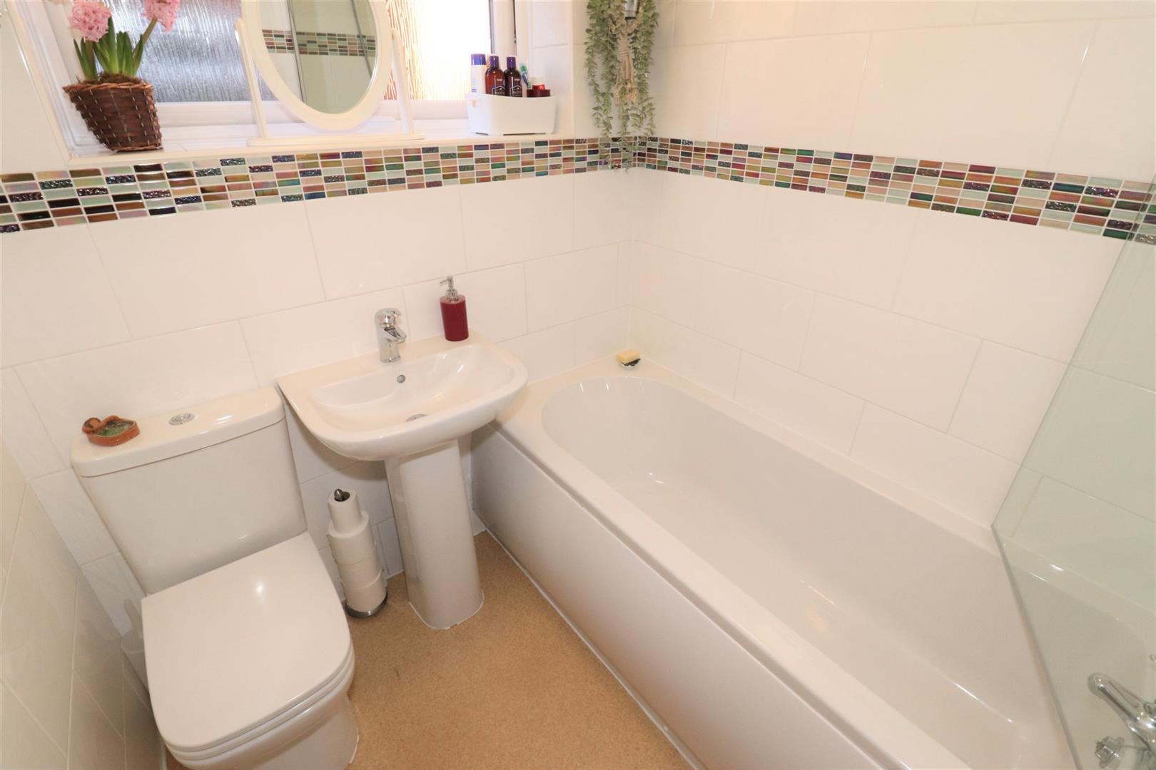 Three piece white suite, low level w.c., pedestal wash hand basin, panelled bath with mains fed shower over bath, shower screen, ceramic tiling to full height to all walls with opaque double glazed window to side, radiator, vinyl covering to floor, extractor fan.