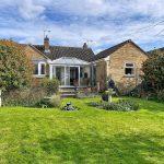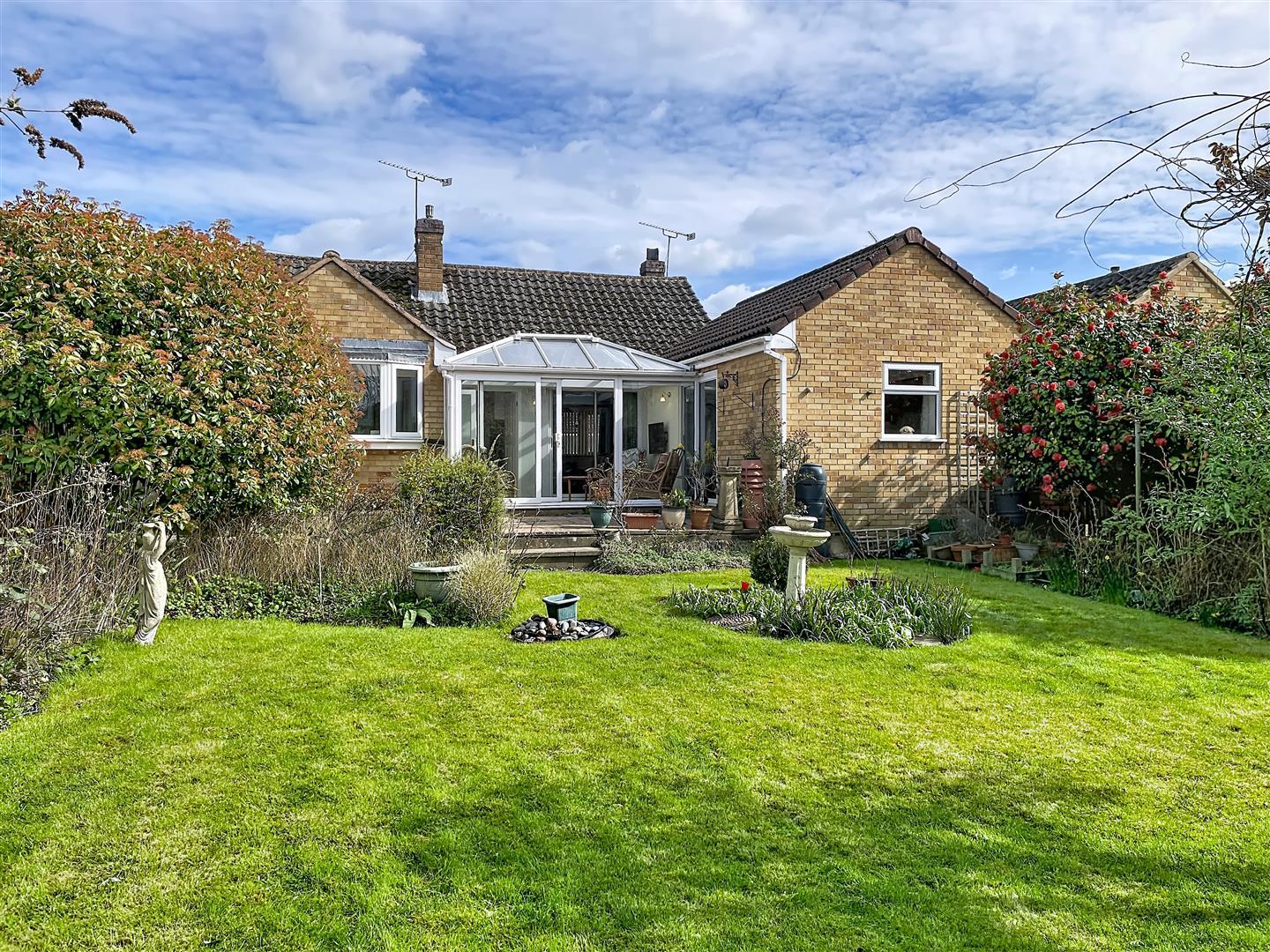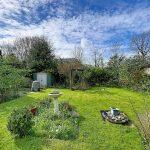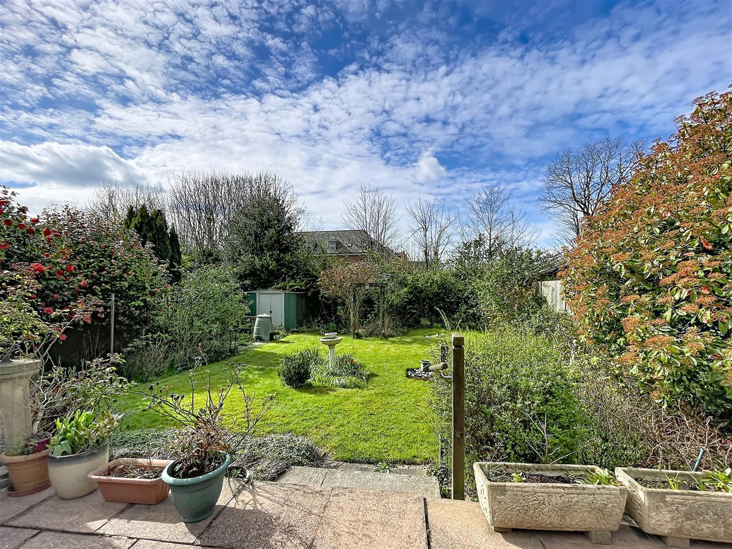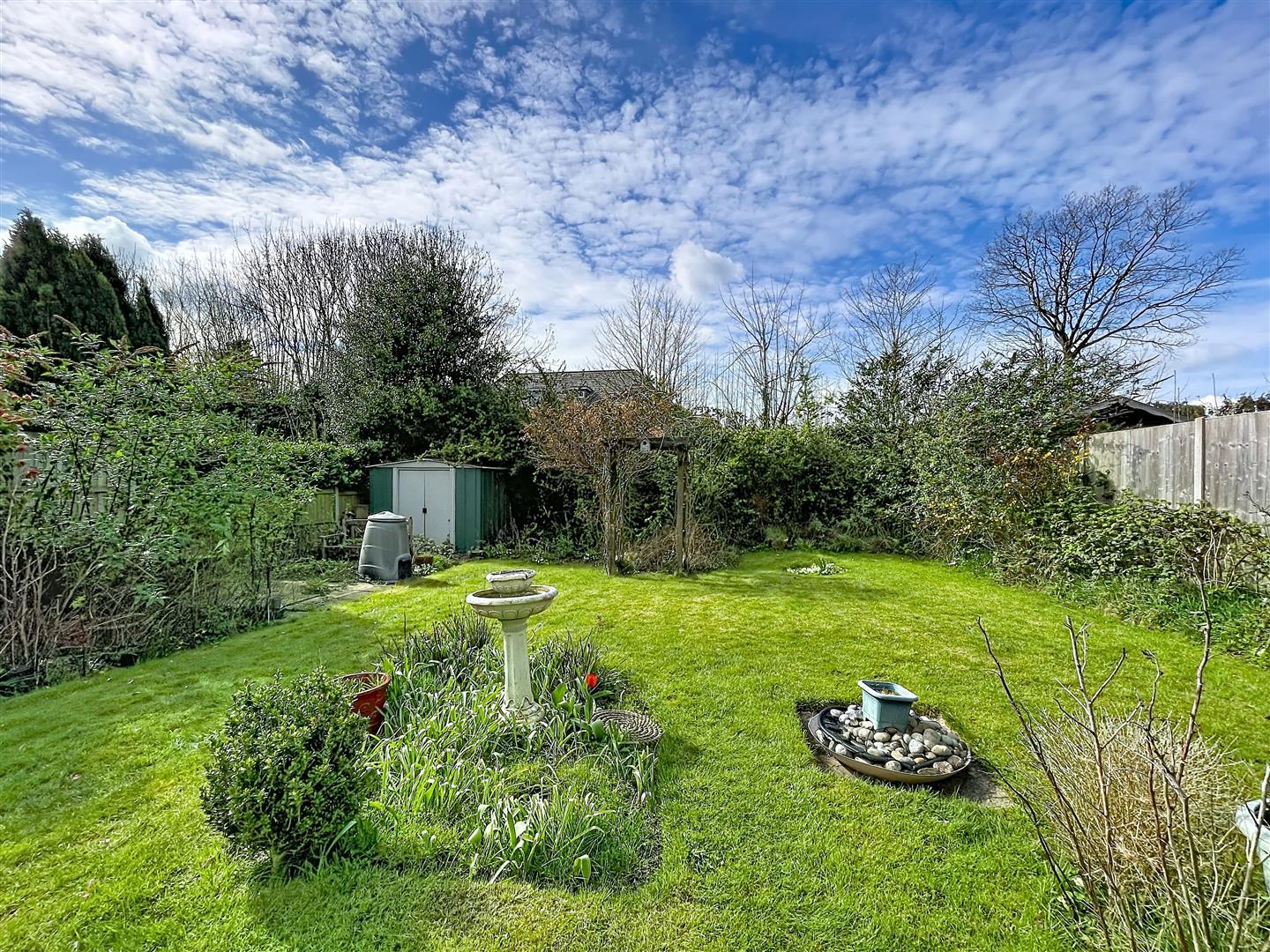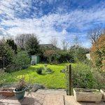 Fully enclosed by perimeter fencing, patio space with step down to lawn with a variety of mature bushes and shrubs with timber side gated entrance and outside tap.