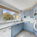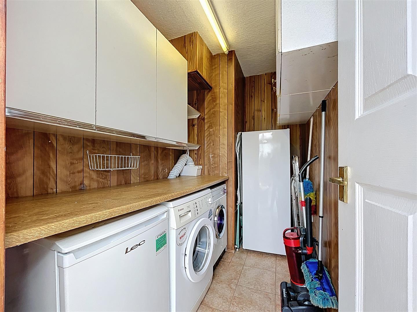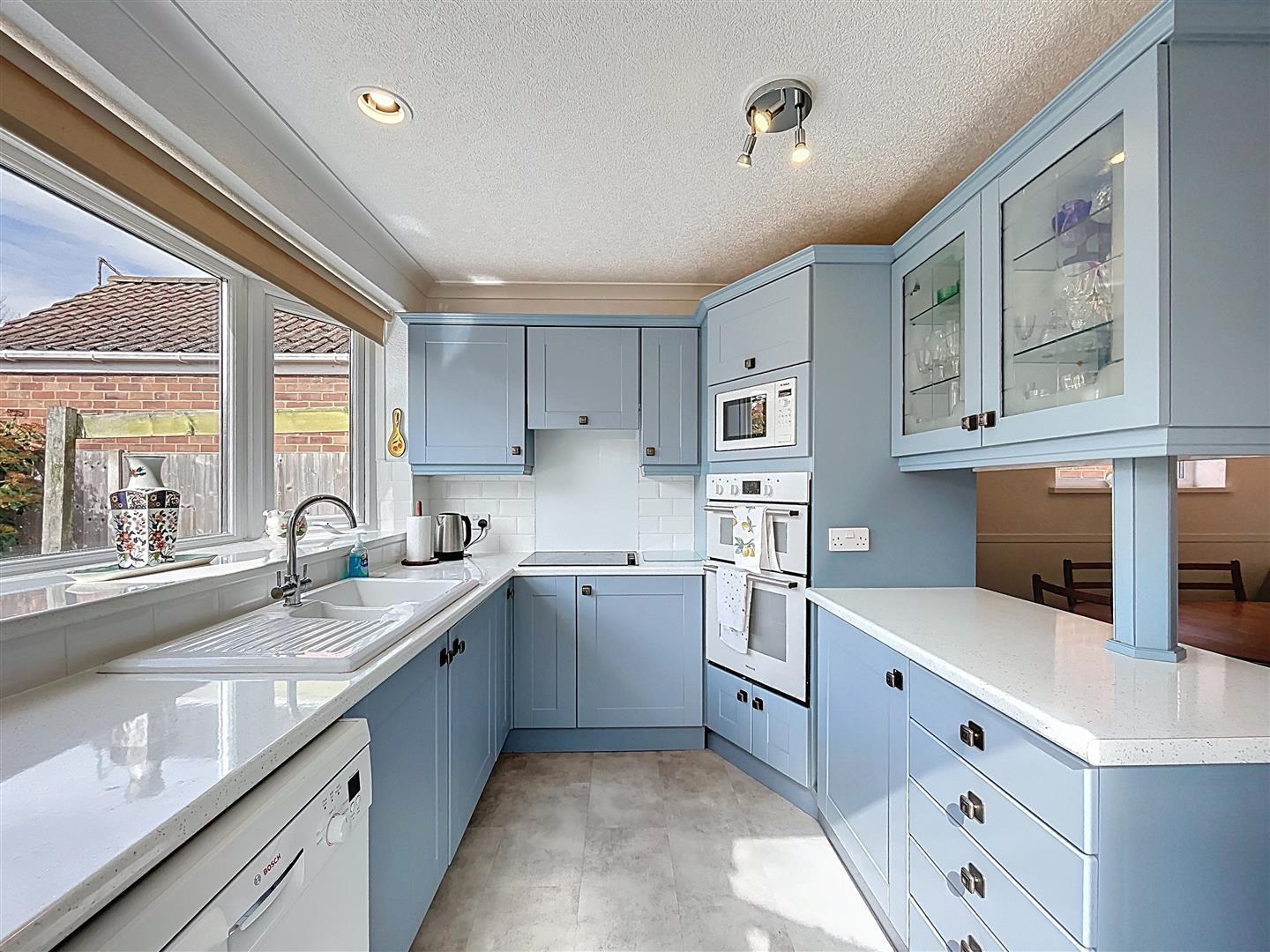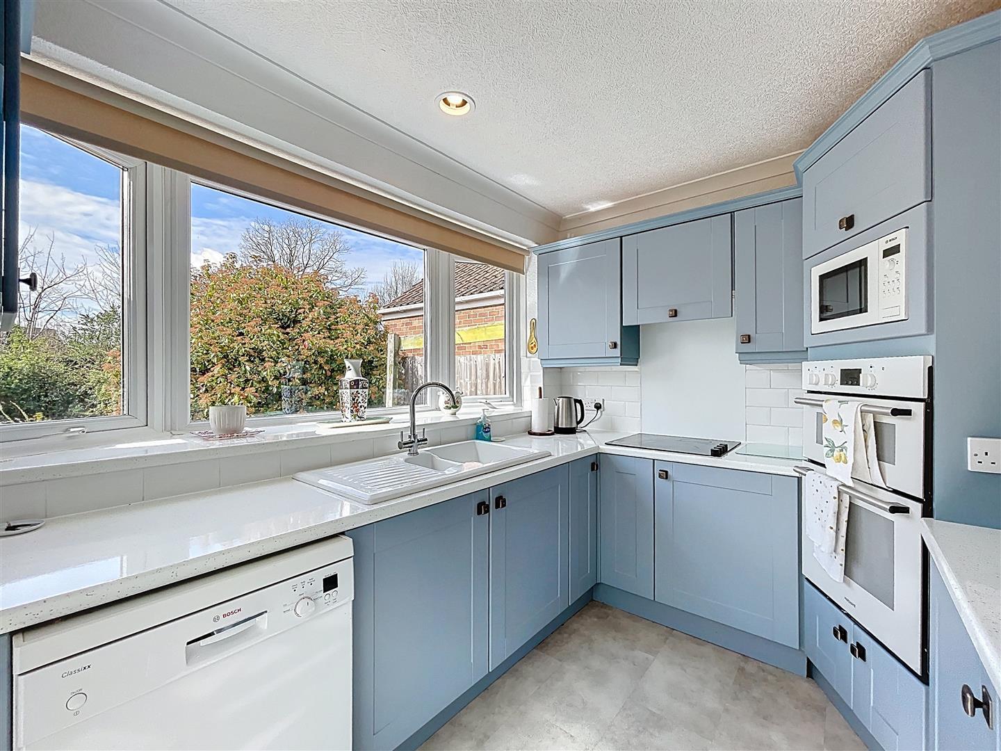 Fitted with a range of matching shaker style base and wall units, with rounded edge work surfaces and a Belfast sink with drainer and a chrome mixer tap with glazed window overlooking the rear garden. It includes a Hotpoint electric hob with a concealed illuminated extractor hood above, and a mid level double fan-assisted oven below with a Bosch integrated microwave above and a freestanding Bosch dishwasher