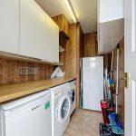 Flat panel wall units, countertop with undercounter fridge, washing machine and dryer with Upright fridge/freezer and strip light above.